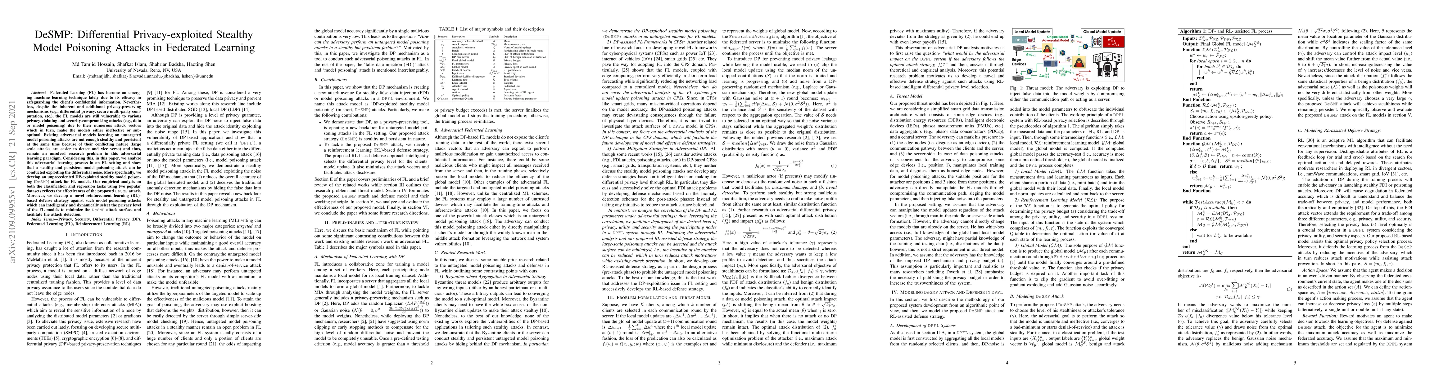 This paper introduces a stealthy and persistent model poisoning attack, named DeSMP, exploiting differential privacy in federated learning (FL) models. The proposed attack effectively undermines the security of FL despite existing privacy-preserving mechanisms, and the paper also presents a reinforcement learning-based defense strategy to mitigate such attacks.