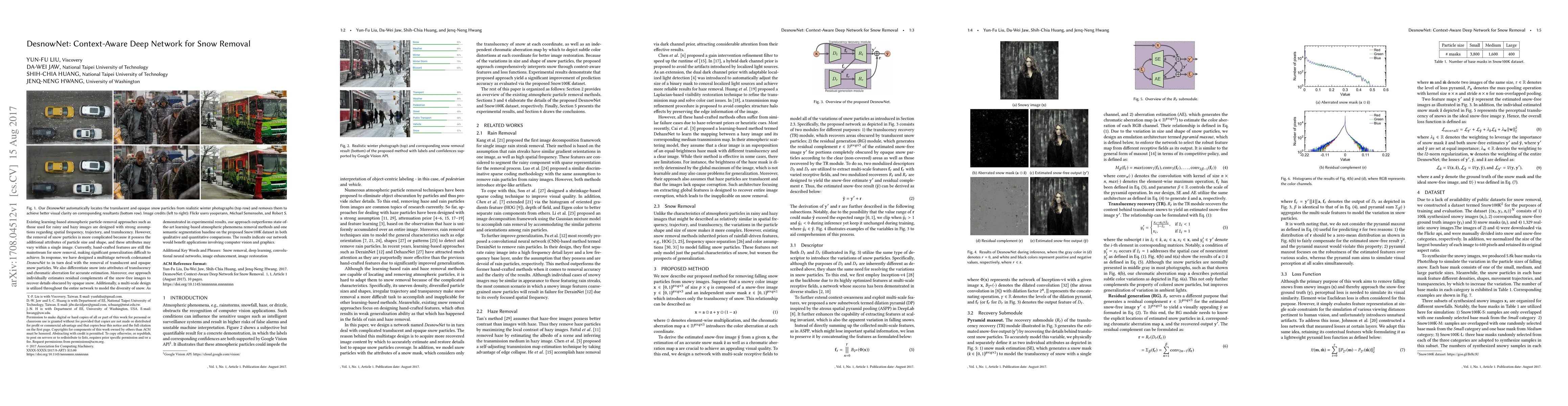 DesnowNet is a context-aware deep network designed to remove snow from images by addressing the unique attributes of snow particles, including size, shape, and translucency. It outperforms existing methods and a semantic segmentation baseline on the Snow100K dataset, demonstrating its effectiveness for computer vision applications.