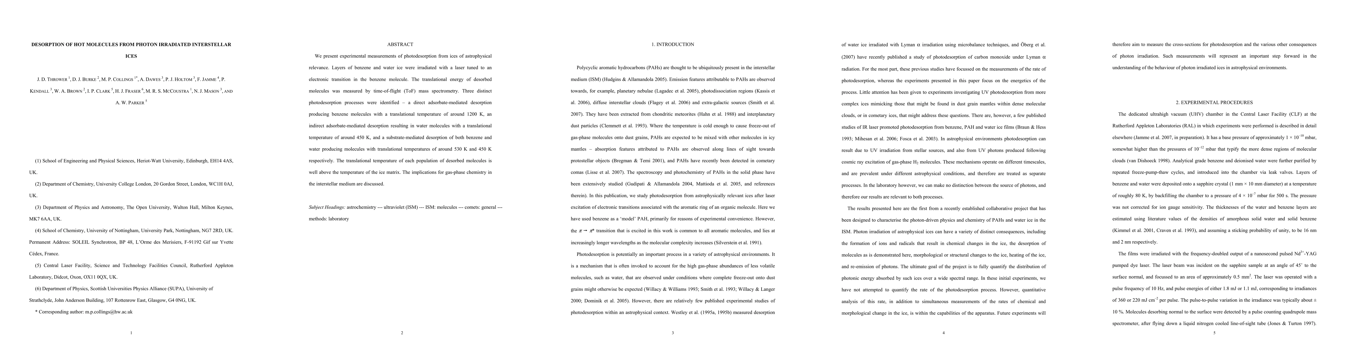 This study experimentally measures photodesorption from astrophysically relevant benzene and water ice layers, identifying three distinct processes that yield desorbed molecules with high translational temperatures, which have significant implications for gas-phase chemistry in the interstellar medium.