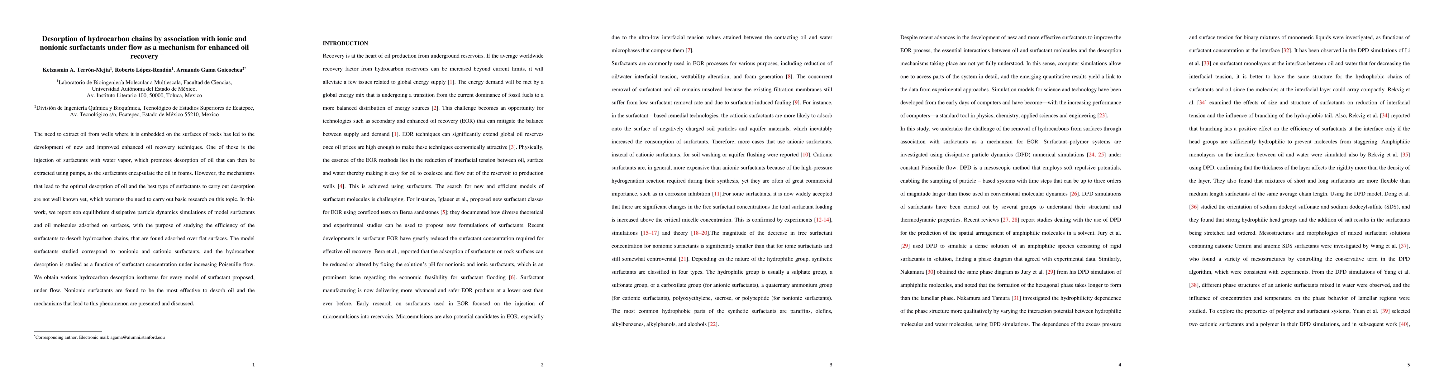 This research investigates the desorption of hydrocarbon chains from rock surfaces using ionic and nonionic surfactants under flow conditions, employing non-equilibrium dissipative particle dynamics simulations. Nonionic surfactants are found to be more effective in desorbing oil compared to ionic surfactants, providing insights into enhanced oil recovery mechanisms.