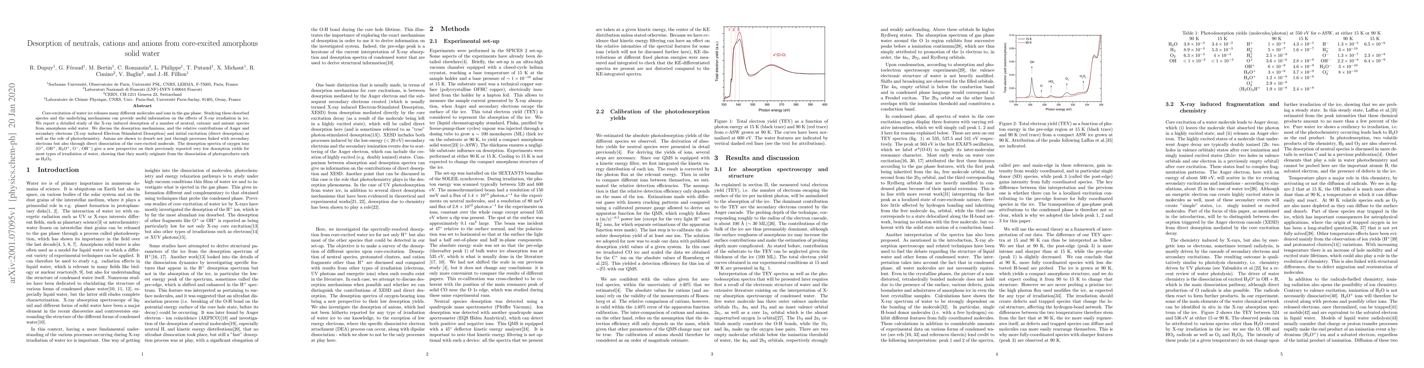This study investigates the desorption of neutrals, cations, and anions from core-excited amorphous solid water, revealing mechanisms involving Auger processes and electron-stimulated desorption. Anions desorb via both secondary electron-induced and direct dissociation processes, providing new insights into their previously low desorption yields.