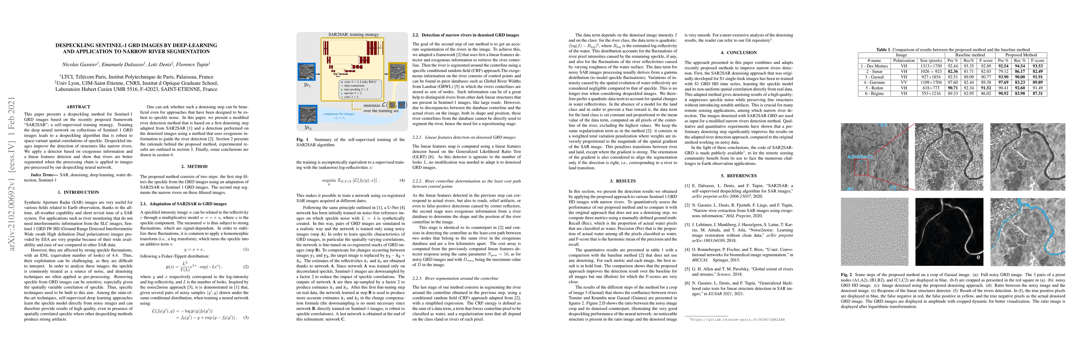 This paper introduces a deep learning-based despeckling method for Sentinel-1 GRD images using the "SAR2SAR" framework, which enhances narrow river segmentation. The neural network, trained on Sentinel-1 data, effectively removes speckle, leading to improved river detection and segmentation.