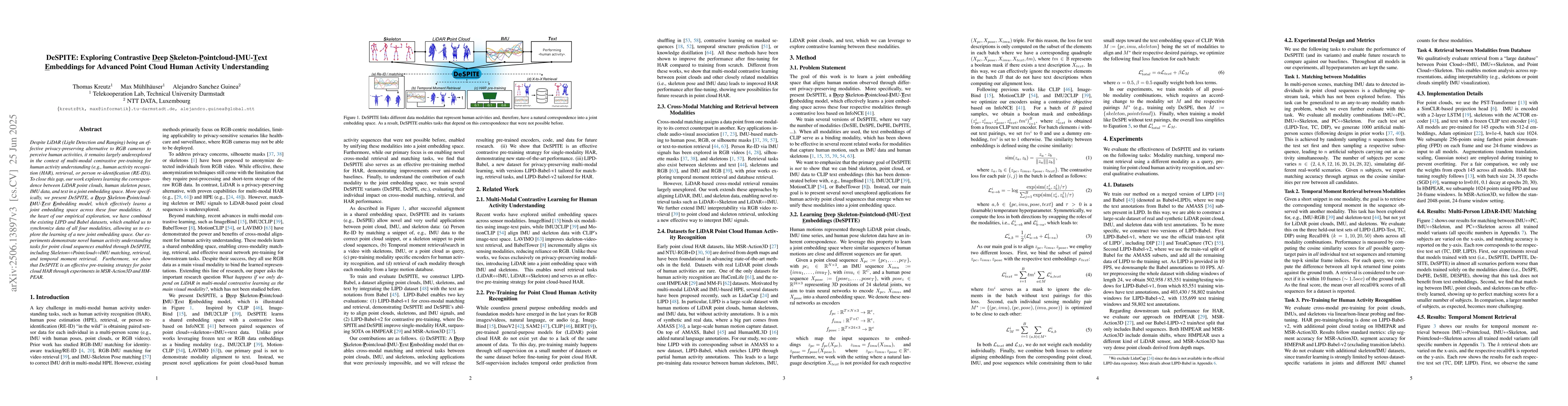 Despite LiDAR (Light Detection and Ranging) being an effective privacy-preserving alternative to RGB cameras to perceive human activities, it remains largely underexplored in the context of multi-modal contrastive pre-training for human activity understanding (e.g., human activity recognition (HAR), retrieval, or person re-identification (RE-ID)). To close this gap, our work explores learning the correspondence between LiDAR point clouds, human skeleton poses, IMU data, and text in a joint embedding space. More specifically, we present DeSPITE, a Deep Skeleton-Pointcloud-IMU-Text Embedding model, which effectively learns a joint embedding space across these four modalities. At the heart of our empirical exploration, we have combined the existing LIPD and Babel datasets, which enabled us to synchronize data of all four modalities, allowing us to explore the learning of a new joint embedding space. Our experiments demonstrate novel human activity understanding tasks for point cloud sequences enabled through DeSPITE, including Skeleton<->Pointcloud<->IMU matching, retrieval, and temporal moment retrieval. Furthermore, we show that DeSPITE is an effective pre-training strategy for point cloud HAR through experiments in MSR-Action3D and HMPEAR.