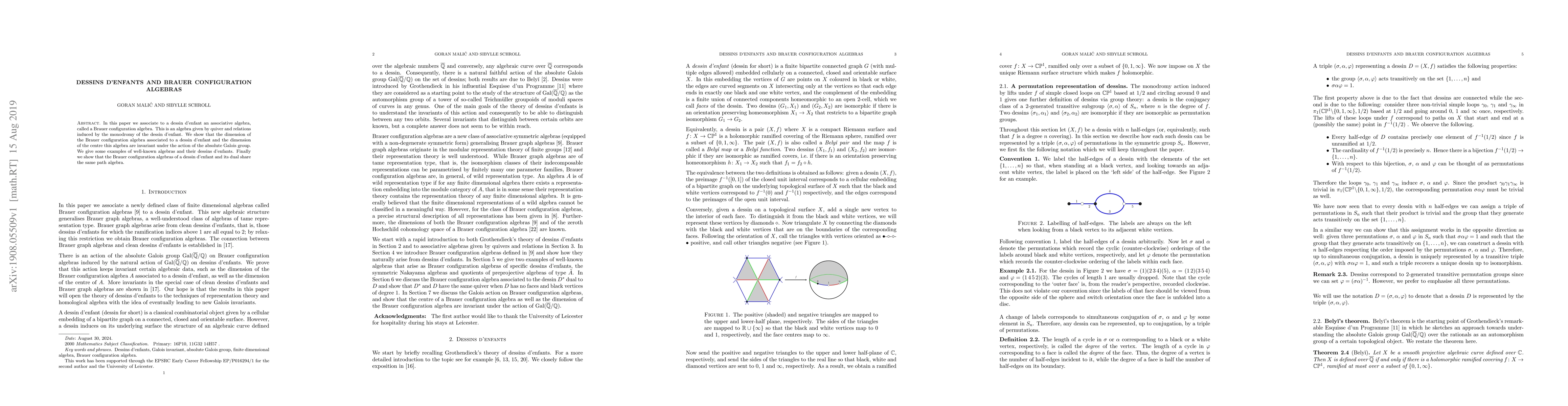 This paper introduces Brauer configuration algebras linked to dessins d'enfants, showing their dimensions and centers remain invariant under the absolute Galois group. It also demonstrates the equality of path algebras between a dessin d'enfant and its dual.
