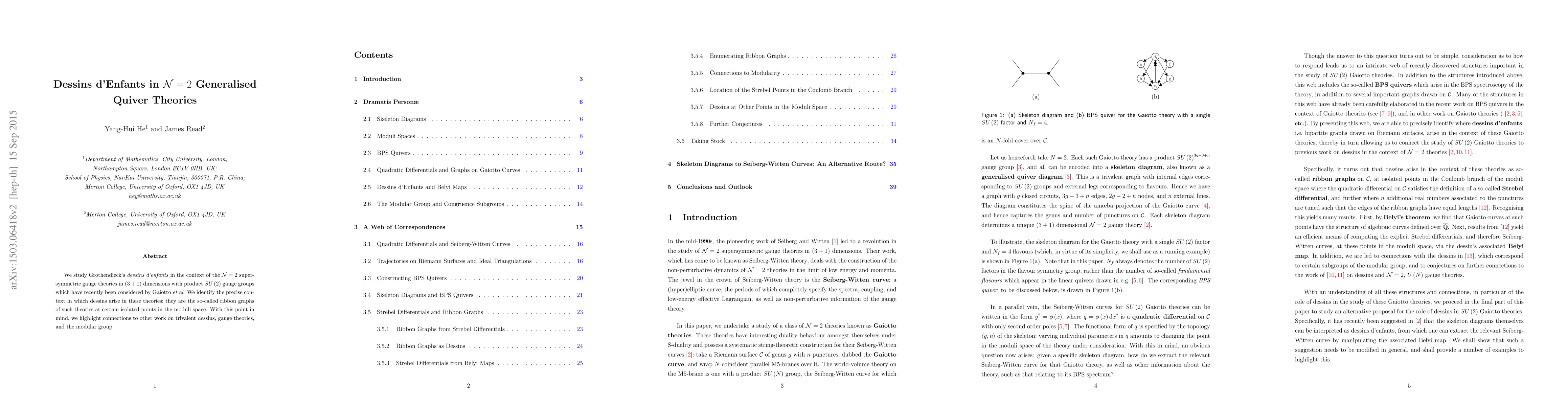 This paper explores Grothendieck's dessins d'enfants within $\mathcal{N}=2$ supersymmetric gauge theories featuring product $SU(2)$ gauge groups, identifying them as ribbon graphs at specific points in the theories' Coulomb branch. It also draws connections to related studies on trivalent dessins, gauge theories, and the modular group.