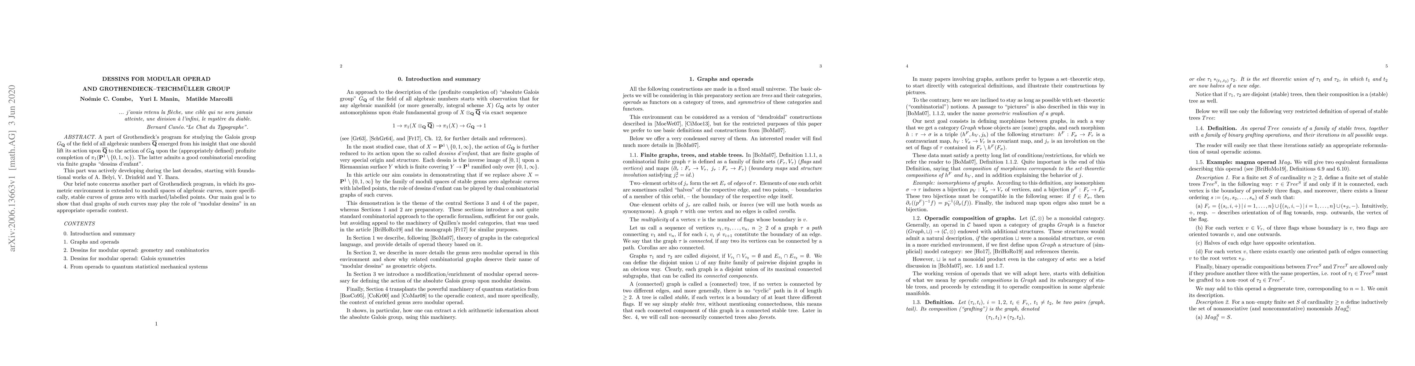 A part of Grothendieck's program for studying the Galois group $G_{\mathbb Q}$ of the field of all algebraic numbers $\overline{\mathbb Q}$ emerged from his insight that one should lift its action upon $\overline{\mathbb Q}$ to the action of $G_{\mathbb Q}$ upon the (appropriately defined) profinite completion of $\pi_1({\mathbb P}^1 \setminus \{0,1, \infty\})$. The latter admits a good combinatorial encoding via finite graphs "dessins d'enfant". This part was actively developing during the last decades, starting with foundational works of A. Belyi, V. Drinfeld and Y. Ihara. Our brief note concerns another part of Grothendieck program, in which its geometric environment is extended to moduli spaces of algebraic curves, more specifically, stable curves of genus zero with marked/labelled points. Our main goal is to show that dual graphs of such curves may play the role of "modular dessins" in an appropriate operadic context.