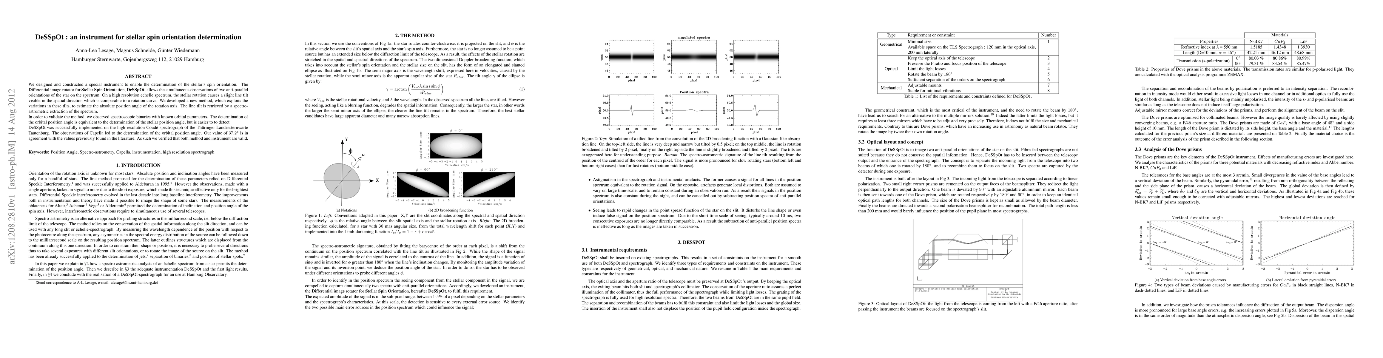We designed and constructed a special instrument to enable the determination of the stellar's spin orientation. The Differential image rotator for Stellar Spin Orientation, DeSSpOt, allows the simultaneous observations of two anti-parallel orientations of the star on the spectrum. On a high resolution \'echelle spectrum, the stellar rotation causes a slight line tilt visible in the spatial direction which is comparable to a rotation curve. We developed a new method, which exploits the variations in these tilts, to estimate the absolute position angle of the rotation axis. The line tilt is retrieved by a spectro-astrometric extraction of the spectrum. In order to validate the method, we observed spectroscopic binaries with known orbital parameters. The determination of the orbital position angle is equivalent to the determination of the stellar position angle, but is easier to to detect. DeSSpOt was successfully implemented on the high resolution Coud\'e spectrograph of the Th\"uringer Landessternwarte Tautenburg. The observations of Capella led to the determination of the orbital position angle.