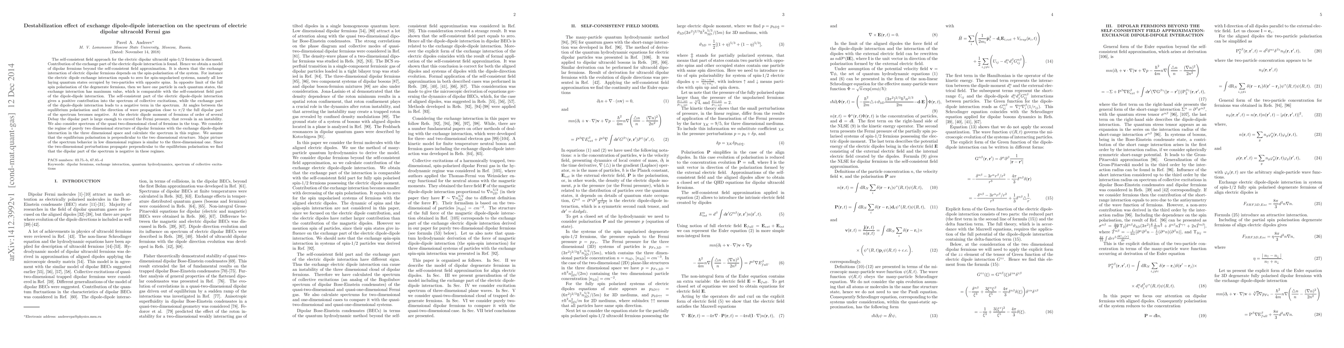 The self-consistent field approach for the electric dipolar ultracold spin-1/2 fermions is discussed. Contribution of the exchange part of the electric dipole interaction is found. Hence we obtain a model of dipolar fermions beyond the self-consistent field approximation. It is shown that the exchange interaction of electric dipolar fermions depends on the spin-polarisation of the system. For instance the electric dipole exchange interaction equals to zero for spin-unpolarised systems, namely all low laying quantum states occupied by two-particles with opposite spins. In opposite limit of the full spin polarisation of the degenerate fermions, then we have one particle in each quantum states, the exchange interaction has maximum value, which is comparable with the self-consistent field part of the dipole-dipole interaction. The self-consistent part of the electric dipole-dipole interaction gives a positive contribution into the spectrum of collective excitations, while the exchange part of the dipole-dipole interaction leads to a negative term in the spectrum. At angles between the equilibrium polarisation and the direction of wave propagation close to $\pi/2$ the full dipolar part of the spectrum becomes negative. At the electric dipole moment of fermions of order of several Debay the dipolar part is large enough to exceed the Fermi pressure, that reveals in an instability.