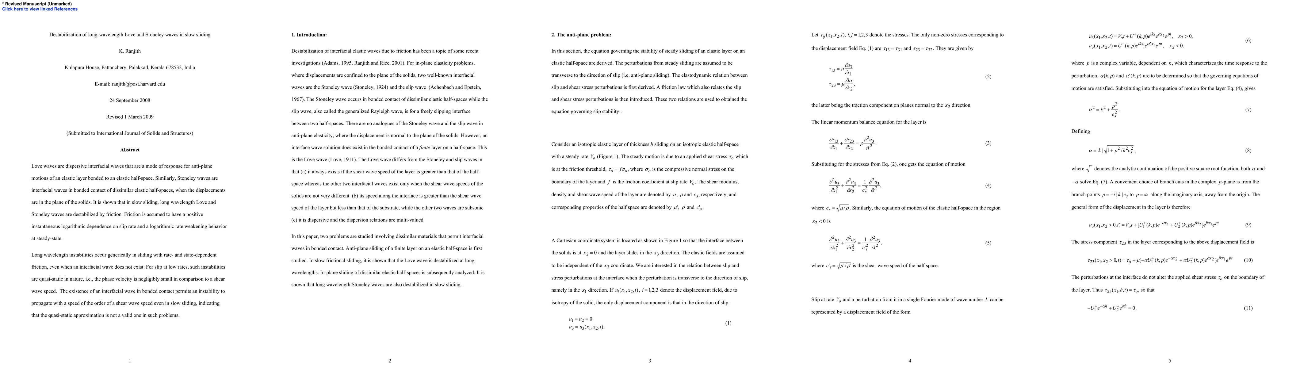 This paper investigates the destabilization of long-wavelength Love and Stoneley waves during slow sliding, demonstrating that friction destabilizes these interfacial waves. The study finds that even in quasi-static conditions, the presence of interfacial waves allows instabilities to propagate at shear wave speeds, invalidating the quasi-static approximation.