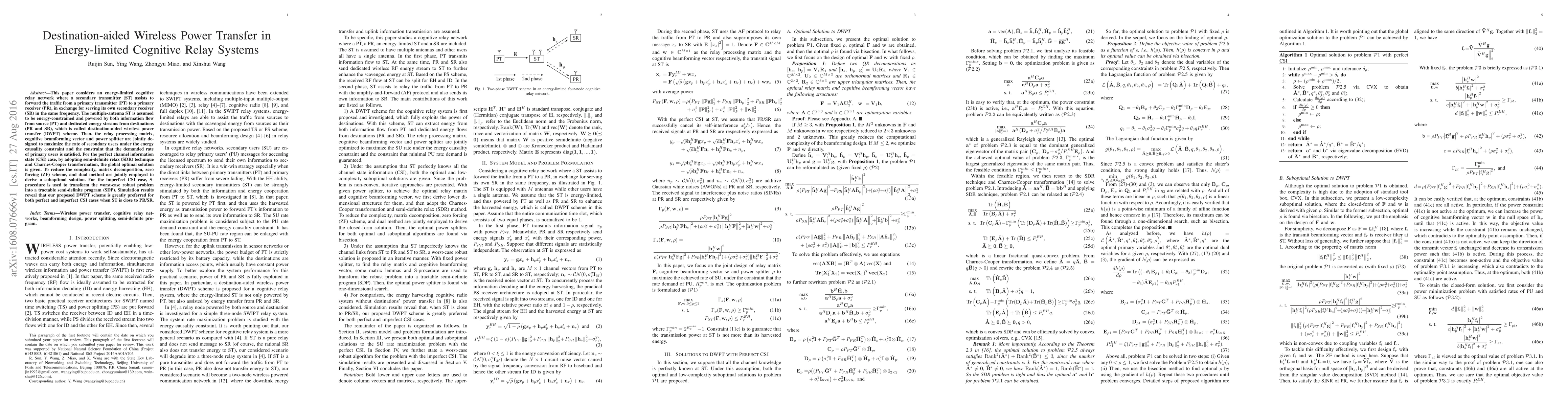 This paper considers an energy-limited cognitive relay network where a secondary transmitter (ST) assists to forward the traffic from a primary transmitter (PT) to a primary receiver (PR), in exchange for serving its own secondary receiver (SR) in the same frequency. The multiple-antenna ST is assumed to be energy-constrained and powered by both information flow from source (PT) and dedicated energy streams from destinations (PR and SR), which is called destination-aided wireless power transfer (DWPT) scheme. Then, the relay processing matrix, cognitive beamforming vector and power splitter are jointly de- signed to maximize the rate of secondary users under the energy causality constraint and the constraint that the demanded rate of primary users is satisfied. For the perfect channel information state (CSI) case, by adopting semi-definite relax (SDR) technique and Charnes-Cooper transformation, the global optimal solution is given. To reduce the complexity, matrix decomposition, zero forcing (ZF) scheme, and dual method are jointly employed to derive a suboptimal solution. For the imperfect CSI case, S- procedure is used to transform the worst-case robust problem into a tractable semi-definite program (SDP). Simulation results reveal that our proposed DWPT scheme is greatly preferred for both perfect and imperfect CSI cases when ST is close to PR/SR.