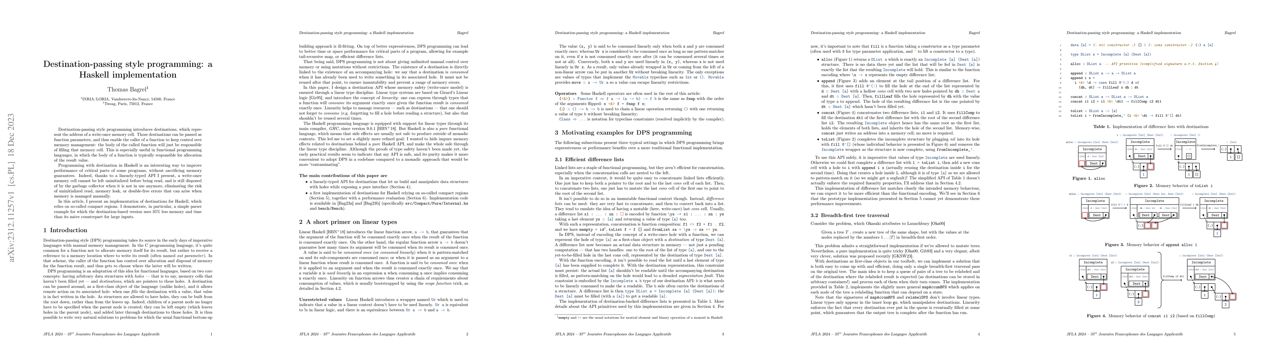 This paper presents a Haskell implementation of destination-passing style programming, which uses destinations to manage memory by passing memory addresses as function parameters, allowing the caller to control memory allocation. The implementation leverages compact regions and a linearly-typed API to enhance performance and prevent memory errors, demonstrated by a parser example that uses 35% less memory and time compared to a naive version.