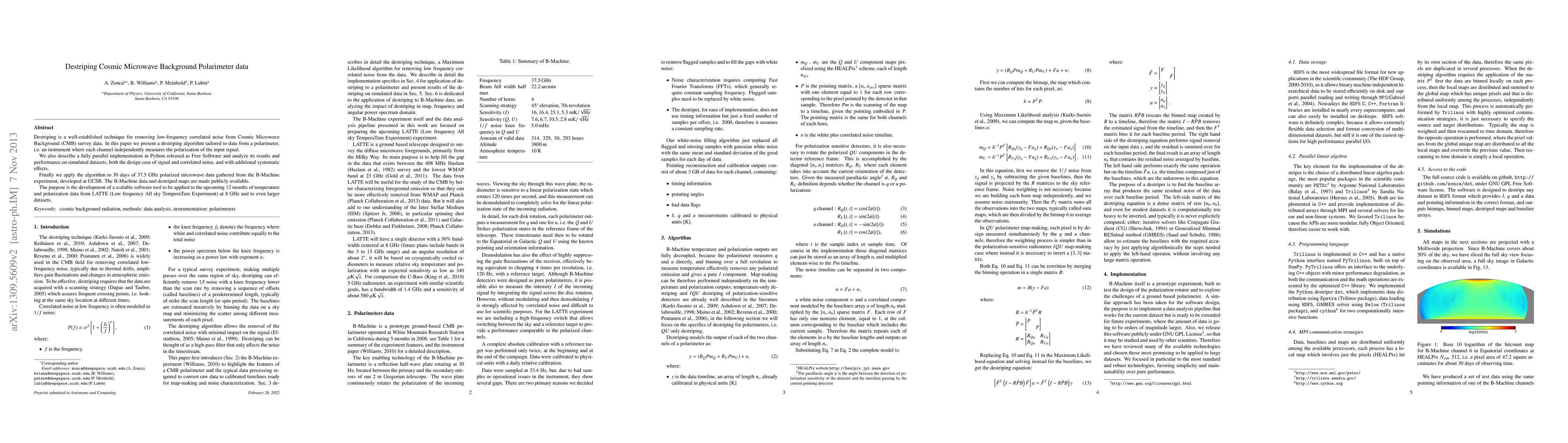 Destriping is a well-established technique for removing low-frequency correlated noise from Cosmic Microwave Background (CMB) survey data. In this paper we present a destriping algorithm tailored to data from a polarimeter, i.e. an instrument where each channel independently measures the polarization of the input signal. We also describe a fully parallel implementation in Python released as Free Software and analyze its results and performance on simulated datasets, both the design case of signal and correlated noise, and with additional systematic effects. Finally we apply the algorithm to 30 days of 37.5 GHz polarized microwave data gathered from the B-Machine experiment, developed at UCSB. The B-Machine data and destriped maps are made publicly available. The purpose is the development of a scalable software tool to be applied to the upcoming 12 months of temperature and polarization data from LATTE (Low frequency All sky TemperaTure Experiment) at 8 GHz and to even larger datasets.