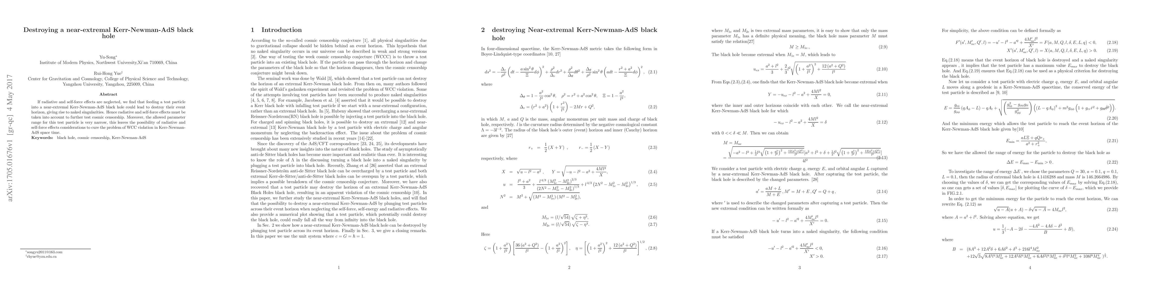 This paper investigates the potential destruction of a near-extremal Kerr-Newman-AdS black hole by feeding a test particle, which could lead to the formation of naked singularities. The study emphasizes the necessity of considering radiative and self-force effects to uphold the cosmic censorship hypothesis.