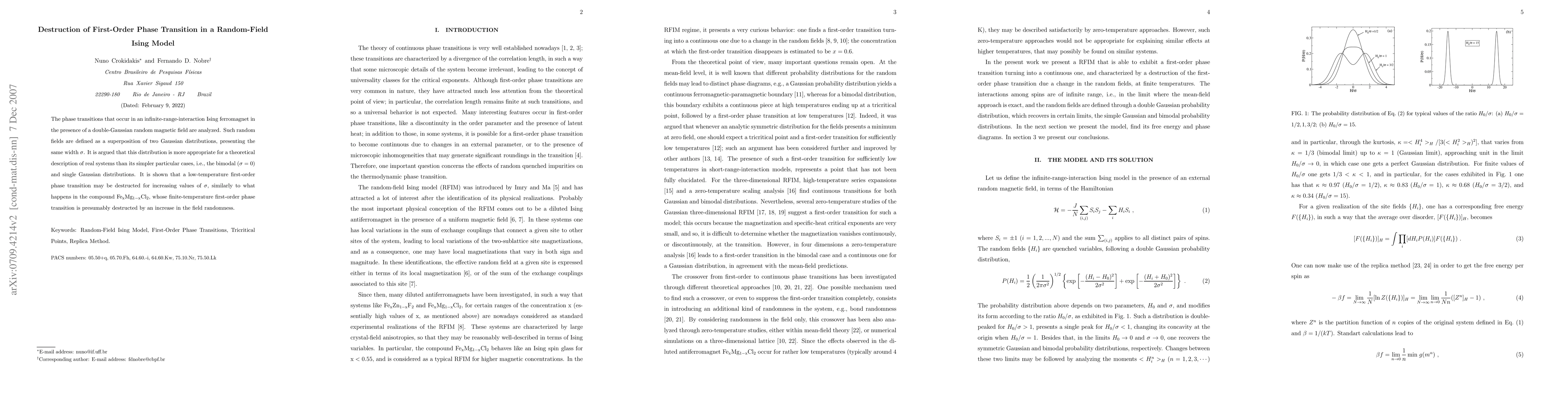 This paper analyzes the impact of a double-Gaussian random magnetic field on phase transitions in an infinite-range-interaction Ising ferromagnet, demonstrating that increasing field randomness can destroy low-temperature first-order phase transitions, akin to the behavior observed in $Fe_{x}Mg_{1-x}Cl_{2}$. The double-Gaussian model is argued to provide a more accurate theoretical description than simpler distributions.