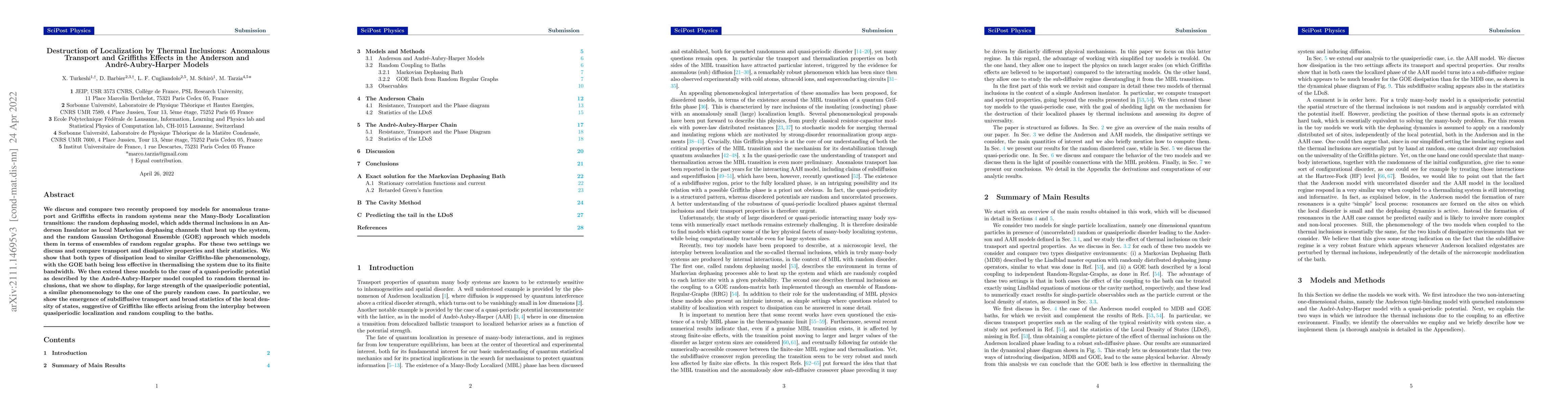 Research models random thermal inclusions in materials to study anomalous transport and Griffiths effects near localization transitions; finds similar phenomenology in both models, suggesting thermal inclusions can induce subdiffusive transport.