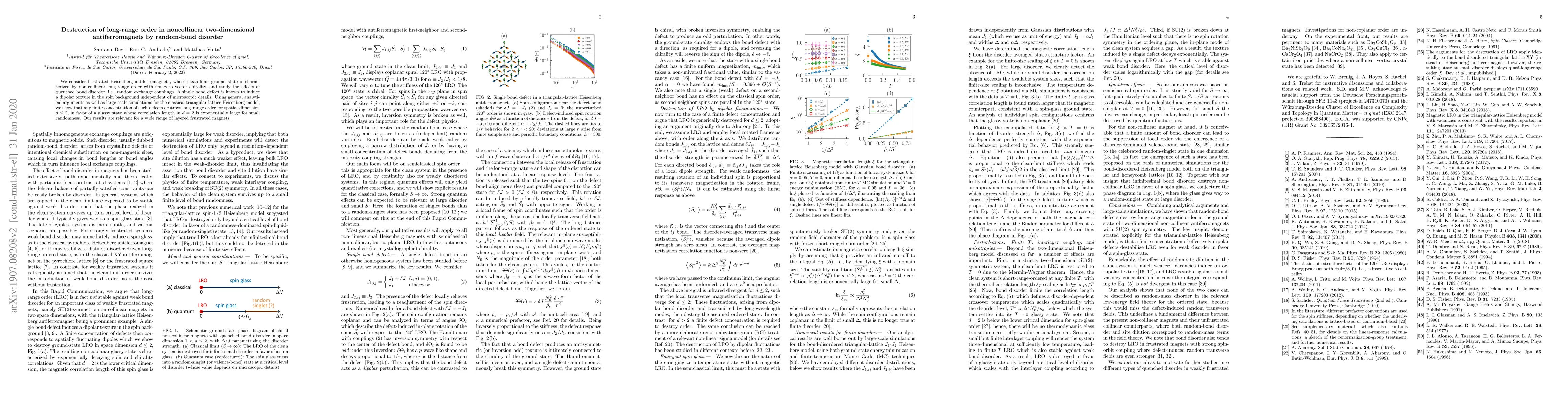 This paper investigates the impact of random-bond disorder on non-collinear long-range order in two-dimensional frustrated Heisenberg antiferromagnets, demonstrating that even a finite concentration of defects disrupts this order, leading to a glassy state with exponentially large correlation length in two dimensions.