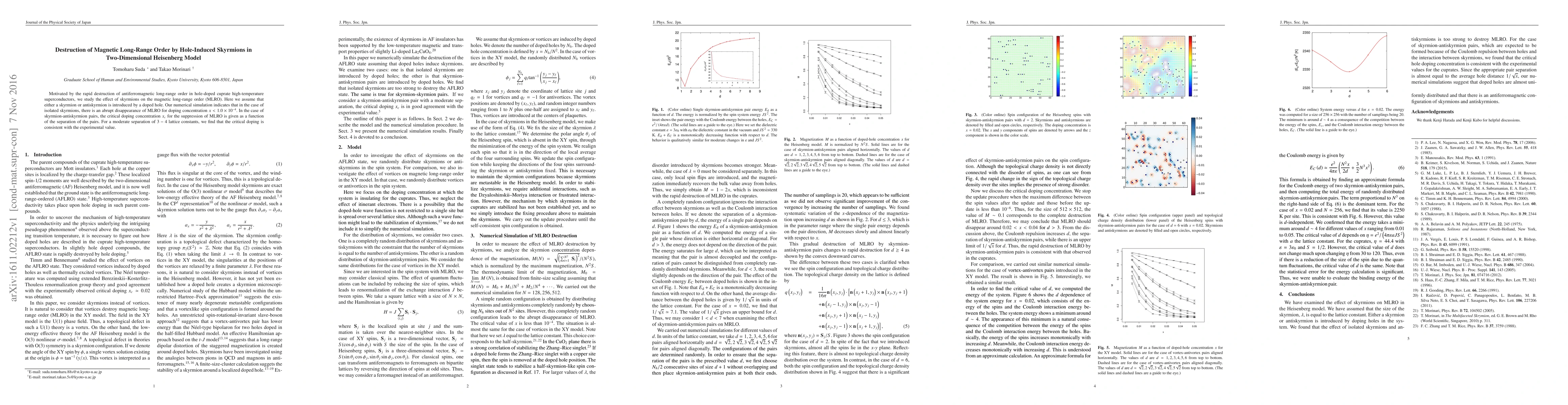 This paper investigates how hole-induced skyrmions disrupt magnetic long-range order in a two-dimensional Heisenberg model, finding that isolated skyrmions cause an abrupt loss of order at low doping concentrations, while skyrmion-antiskyrmion pairs exhibit a critical doping threshold dependent on their separation, aligning with experimental observations in cuprate superconductors.