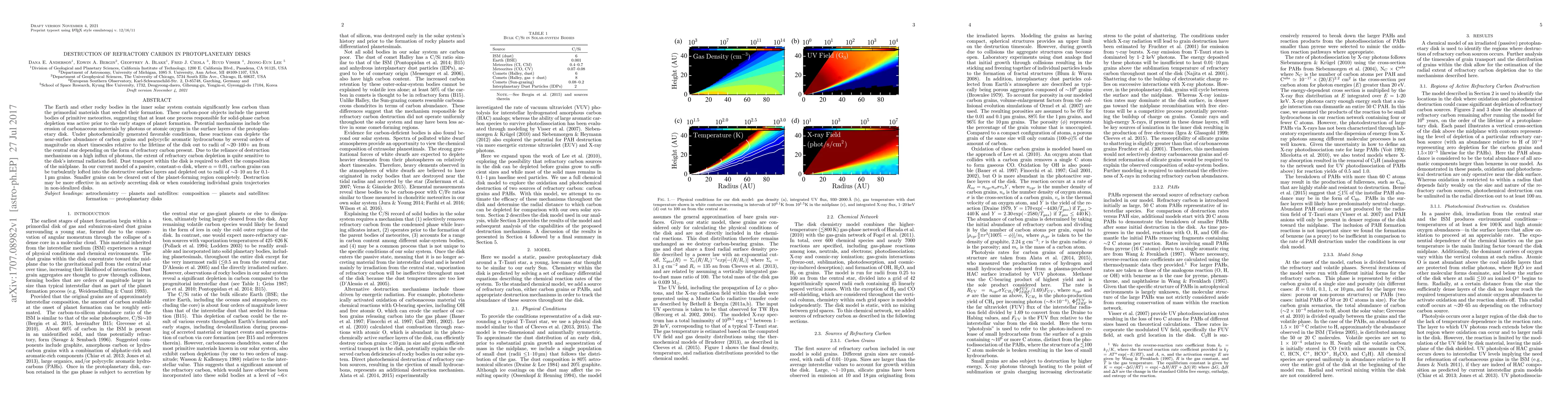 This paper investigates the depletion of refractory carbon in protoplanetary disks through photochemical reactions driven by photons and atomic oxygen, explaining how carbon grains and polycyclic aromatic hydrocarbons can be significantly reduced in abundance within the disk's surface layers, particularly affecting grains within 3-10 au from the central star. The study highlights the sensitivity of carbon depletion to the disk's radiation field and the role of dust transport in altering the midplane composition.