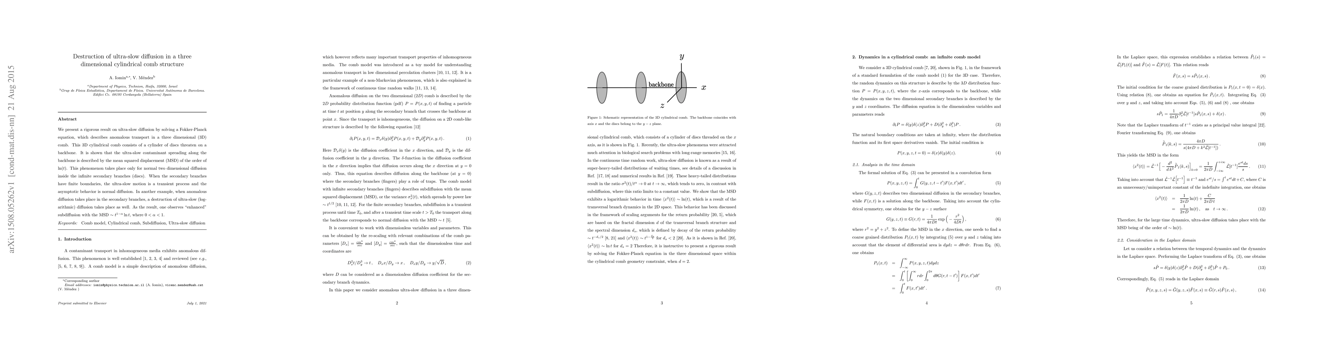 We present a rigorous result on ultra-slow diffusion by solving a Fokker-Planck equation, which describes anomalous transport in a three dimensional (3D) comb. This 3D cylindrical comb consists of a cylinder of discs threaten on a backbone. It is shown that the ultra-slow contaminant spreading along the backbone is described by the mean squared displacement (MSD) of the order of $\ln (t)$. This phenomenon takes place only for normal two dimensional diffusion inside the infinite secondary branches (discs). When the secondary branches have finite boundaries, the ultra-slow motion is a transient process and the asymptotic behavior is normal diffusion. In another example, when anomalous diffusion takes place in the secondary branches, a destruction of ultra-slow (logarithmic) diffusion takes place as well. As the result, one observes "enhanced" subdiffusion with the MSD $\sim t^{1-\alpha}\ln t$, where $0<\alpha<1$.