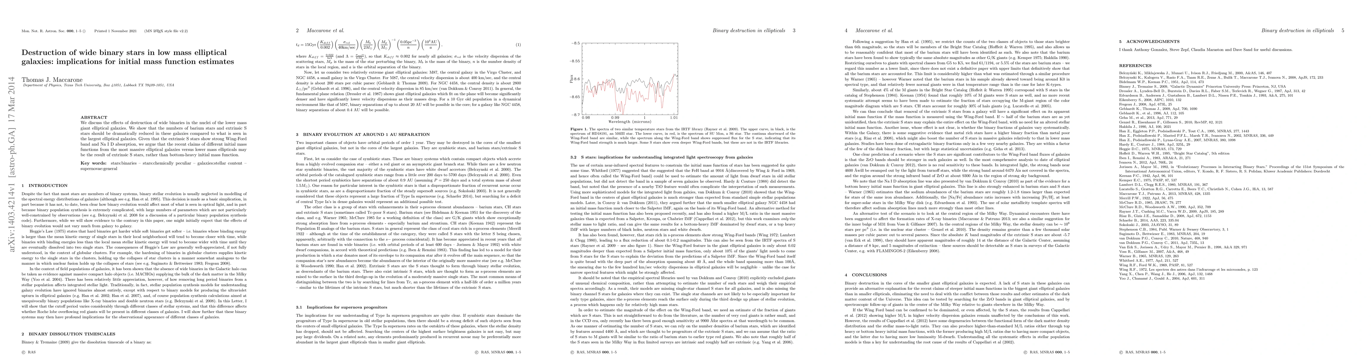 This paper examines the impact of wide binary star destruction in low-mass elliptical galaxies on the observed stellar populations, suggesting a reduction in barium and extrinsic S stars. It posits that differences in initial mass function estimates between large and small elliptical galaxies may stem from the presence of extrinsic S stars rather than a true difference in initial mass functions.