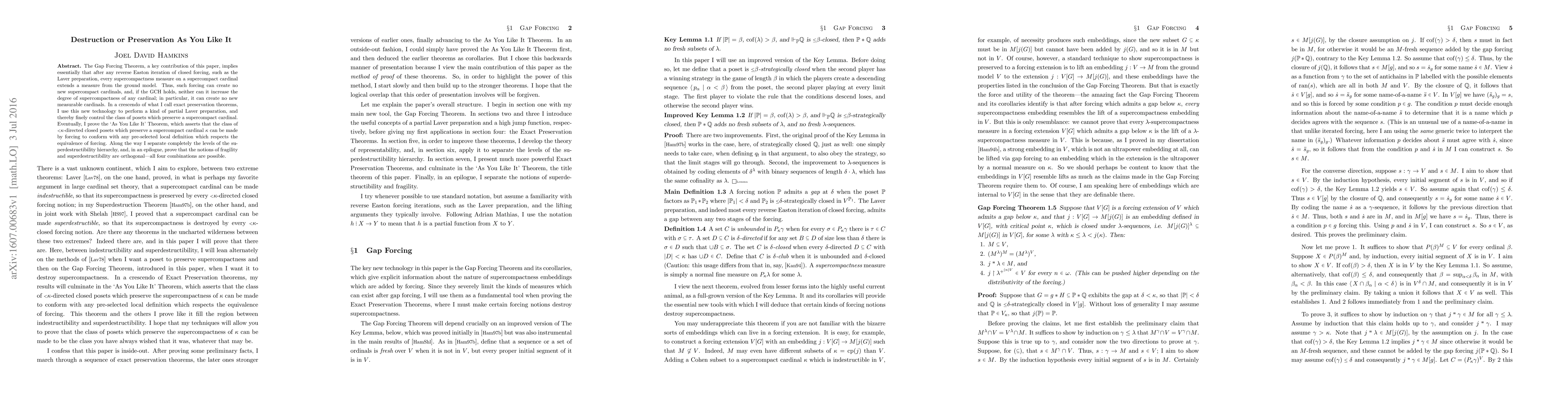 The Gap Forcing Theorem, a key contribution of this paper, implies essentially that after any reverse Easton iteration of closed forcing, such as the Laver preparation, every supercompactness measure on a supercompact cardinal extends a measure from the ground model. Thus, such forcing can create no new supercompact cardinals, and, if the GCH holds, neither can it increase the degree of supercompactness of any cardinal; in particular, it can create no new measurable cardinals. In a crescendo of what I call exact preservation theorems, I use this new technology to perform a kind of partial Laver preparation, and thereby finely control the class of posets which preserve a supercompact cardinal. Eventually, I prove the `As You Like It' Theorem, which asserts that the class of ${<}\kappa$-directed closed posets which preserve a supercompact cardinal $\kappa$ can be made by forcing to conform with any pre-selected local definition which respects the equivalence of forcing. Along the way I separate completely the levels of the superdestructibility hierarchy, and, in an epilogue, prove that the notions of fragility and superdestructibility are orthogonal---all four combinations are possible.