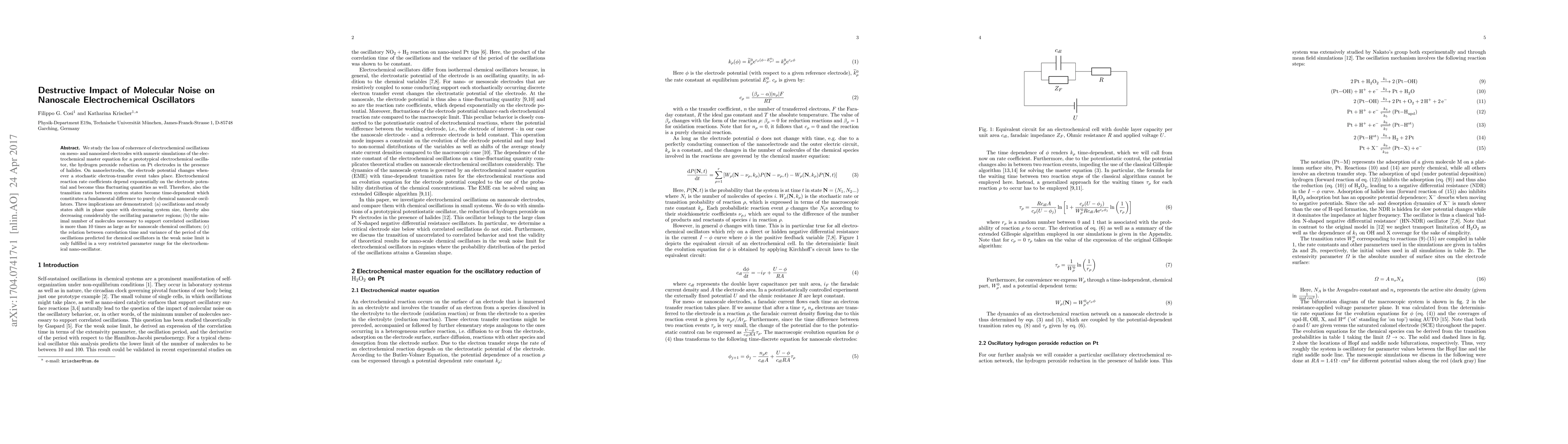This paper investigates the impact of molecular noise on nanoscale electrochemical oscillators, demonstrating that stochastic electron-transfer events cause potential fluctuations that disrupt coherence. It finds that nanoscale electrochemical oscillators require significantly more molecules to maintain correlated oscillations compared to purely chemical oscillators.