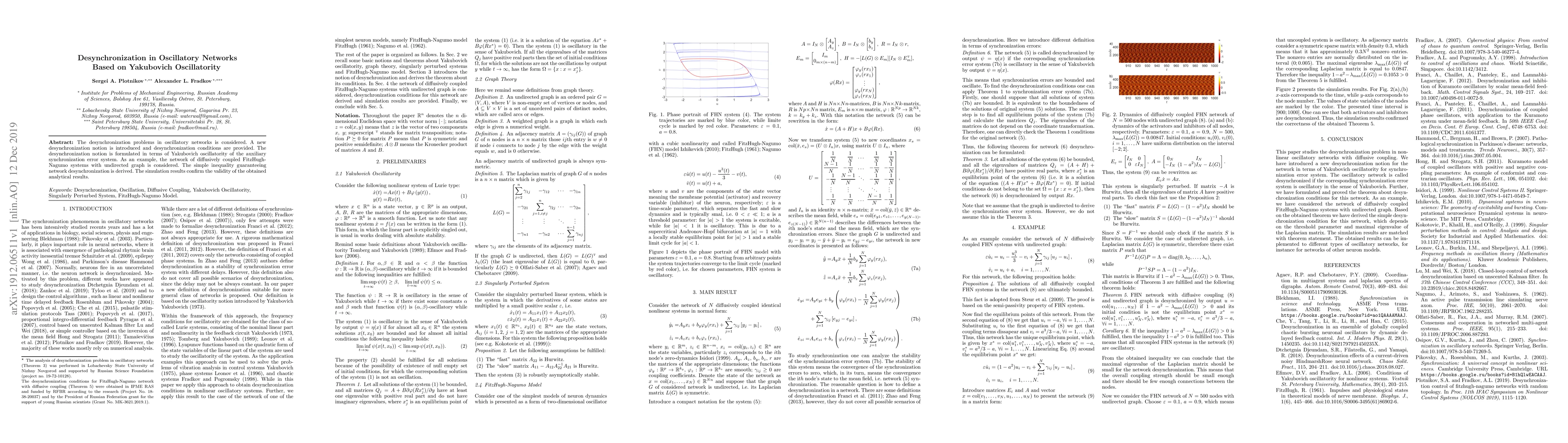 This paper introduces a new notion of desynchronization in oscillatory networks based on Yakubovich oscillatority, providing conditions for desynchronization. It applies this framework to a network of diffusively coupled FitzHugh-Nagumo systems, deriving a simple inequality that guarantees desynchronization, with simulation results validating the analytical findings.