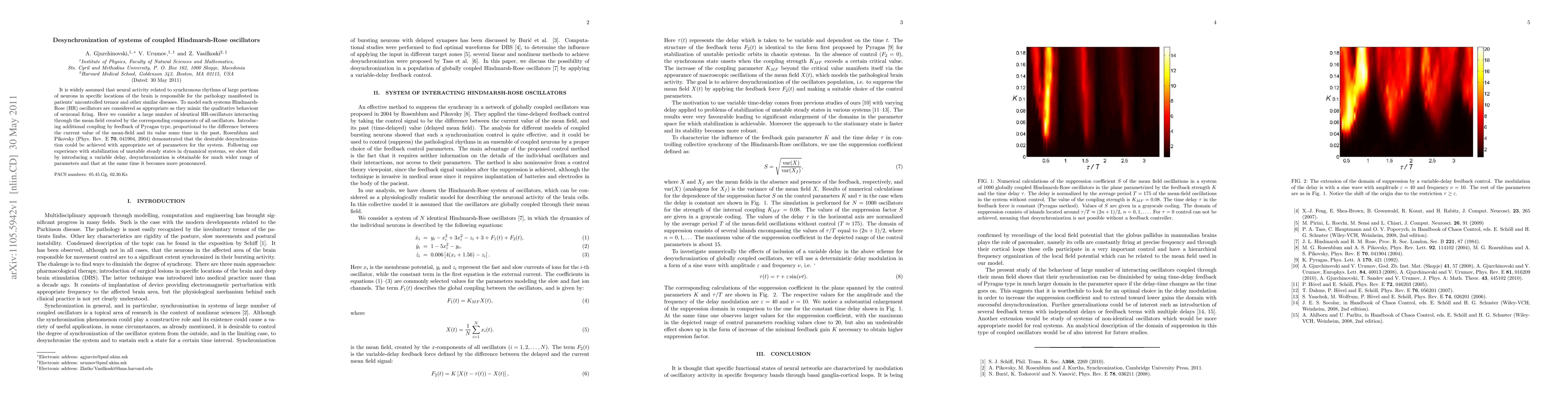 It is widely assumed that neural activity related to synchronous rhythms of large portions of neurons in specific locations of the brain is responsible for the pathology manifested in patients' uncontrolled tremor and other similar diseases. To model such systems Hindmarsh-Rose (HR) oscillators are considered as appropriate as they mimic the qualitative behaviour of neuronal firing. Here we consider a large number of identical HR-oscillators interacting through the mean field created by the corresponding components of all oscillators. Introducing additional coupling by feedback of Pyragas type, proportional to the difference between the current value of the mean-field and its value some time in the past, Rosenblum and Pikovsky (Phys. Rev. E 70, 041904, 2004) demonstrated that the desirable desynchronization could be achieved with appropriate set of parameters for the system. Following our experience with stabilization of unstable steady states in dynamical systems, we show that by introducing a variable delay, desynchronization is obtainable for much wider range of parameters and that at the same time it becomes more pronounced.