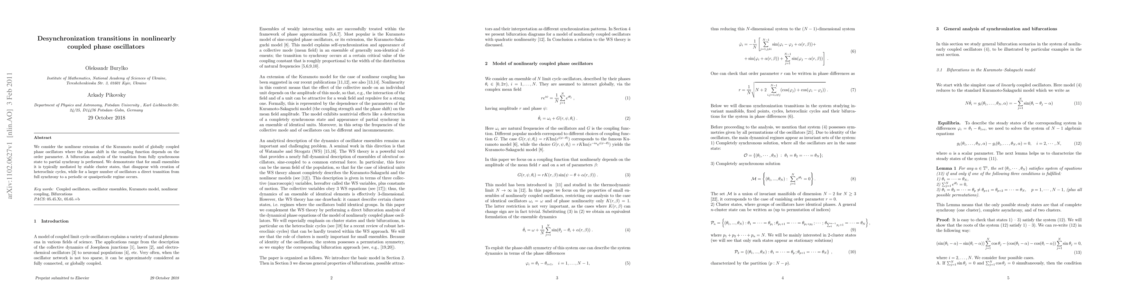 This paper studies the nonlinear extension of the Kuramoto model for globally coupled phase oscillators, focusing on the bifurcation analysis leading to desynchronization. It finds that small ensembles transition to partial synchrony via stable cluster states, while larger ensembles undergo a direct transition to periodic or quasiperiodic regimes.