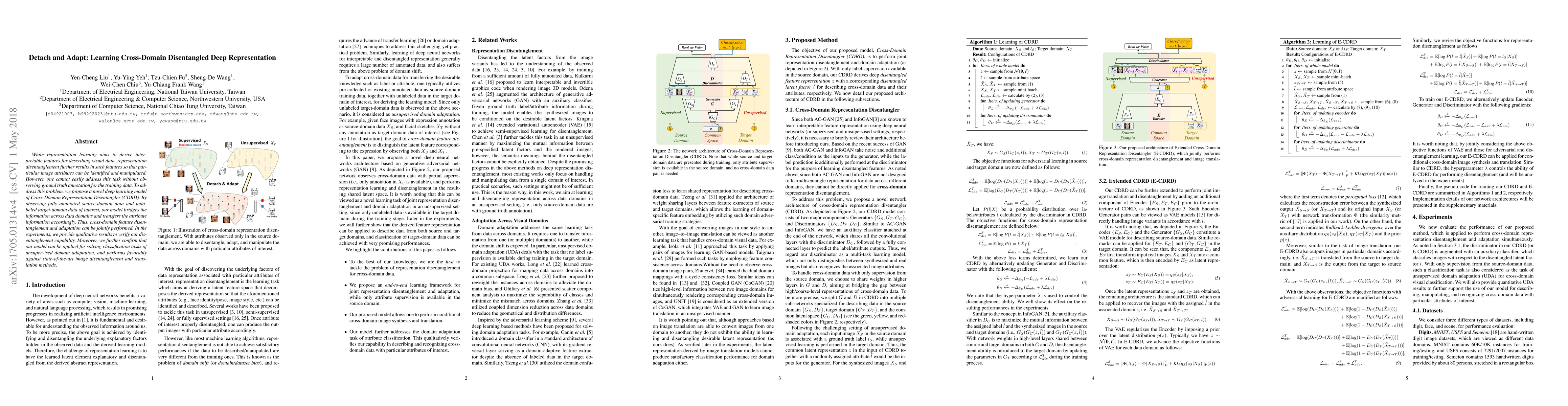 This paper proposes a Cross-Domain Representation Disentangler (CDRD) model to learn disentangled deep representations across different domains using annotated source-domain data and unlabeled target-domain data. The model achieves cross-domain joint feature disentanglement and adaptation, demonstrating favorable performance in unsupervised domain adaptation classification tasks.