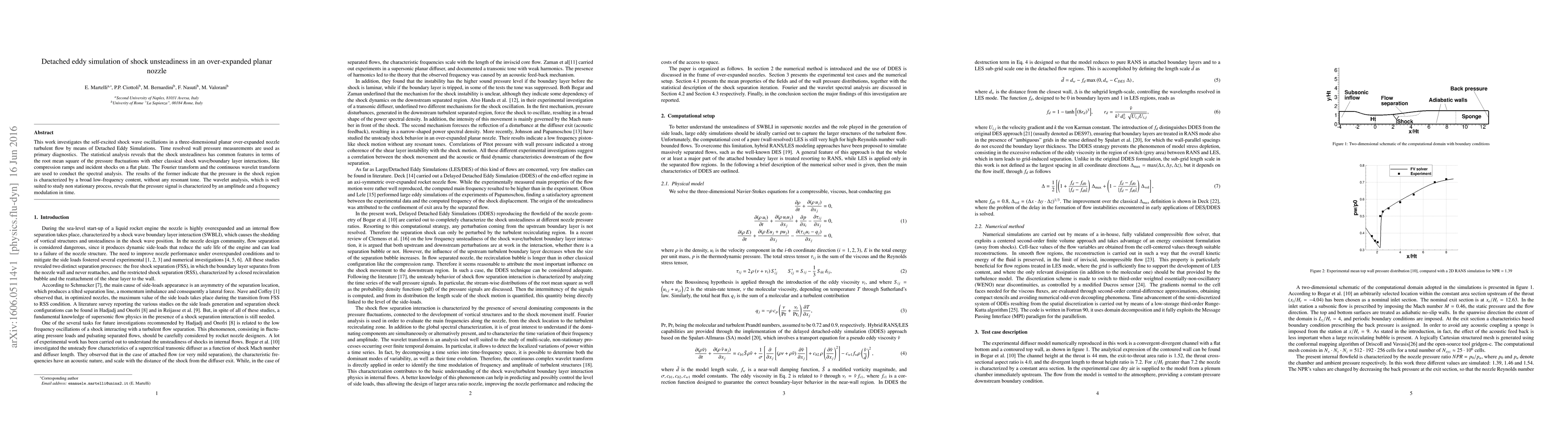 This work investigates the self-excited shock wave oscillations in a three-dimensional planar over-expanded nozzle turbulent flow by means of Detached Eddy Simulations. Time resolved wall pressure measurements are used as primary diagnostics. The statistical analysis reveals that the shock unsteadiness has common features in terms of the root mean square of the pressure fluctuations with other classical shock wave/boundary layer interactions, like compression ramps and incident shocks on a flat plate. The Fourier transform and the continuous wavelet transform are used to conduct the spectral analysis. The results of the former indicate that the pressure in the shock region is characterized by a broad low-frequency content, without any resonant tone. The wavelet analysis, which is well suited to study non stationary process, reveals that the pressure signal is characterized by an amplitude and a frequency modulation in time.