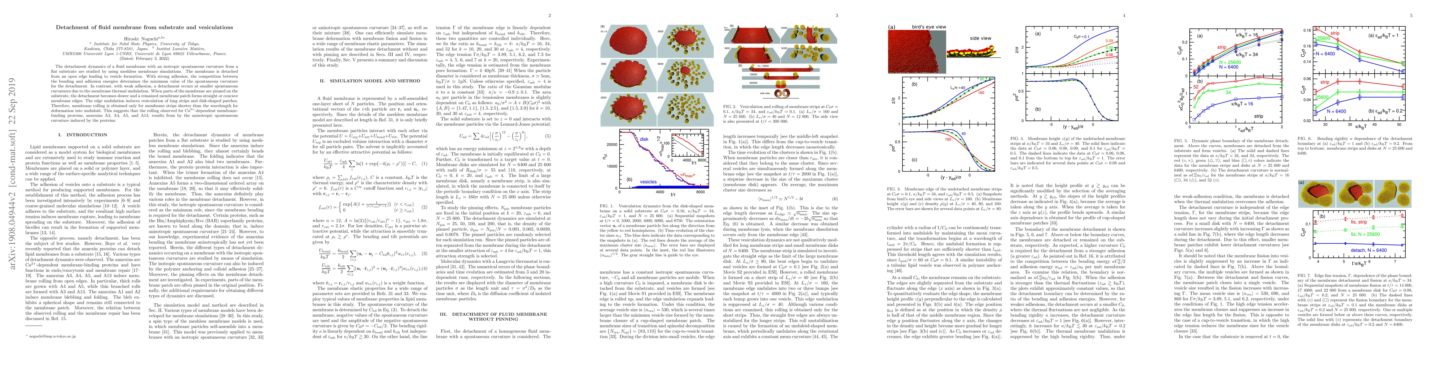 The detachment dynamics of a fluid membrane with an isotropic spontaneous curvature from a flat substrate are studied by using meshless membrane simulations. The membrane is detached from an open edge leading to vesicle formation. With strong adhesion, the competition between the bending and adhesion energies determines the minimum value of the spontaneous curvature for the detachment. In contrast, with weak adhesion, a detachment occurs at smaller spontaneous curvatures due to the membrane thermal undulation. When parts of the membrane are pinned on the substrate, the detachment becomes slower and a remained membrane patch forms straight or concave membrane edges. The edge undulation induces vesiculation of long strips and disk-shaped patches. Therefore, membrane rolling is obtained only for membrane strips shorter than the wavelength for deformation into unduloid. This suggests that the rolling observed for Ca$^{2+}$-dependent membrane-binding proteins, annexins A3, A4, A5, and A13, results from by the anisotropic spontaneous curvature induced by the proteins.