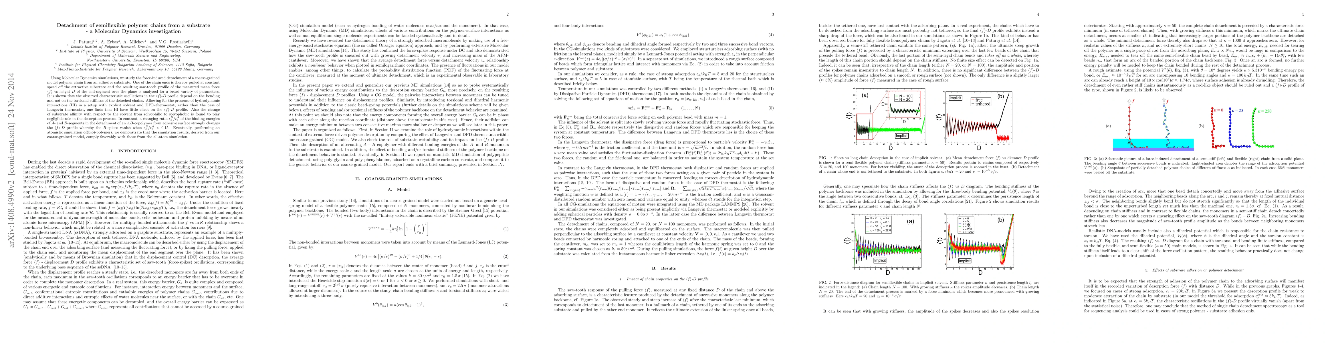 Using Molecular Dynamics simulations, we study the force-induced detachment of a coarse-grained model polymer chain from an adhesive substrate. One of the chain ends is thereby pulled at constant speed off the attractive substrate and the resulting saw-tooth profile of the measured mean force $< f >$ vs height $D$ of the end-segment over the plane is analyzed for a broad variety of parameters. It is shown that the observed characteristic oscillations in the $< f >$-$D$ profile depend on the bending and not on the torsional stiffness of the detached chains. Allowing for the presence of hydrodynamic interactions (HI) in a setup with explicit solvent and DPD-thermostat, rather than the case of Langevin thermostat, one finds that HI have little effect on the $< f >$-$D$ profile. Also the change of substrate affinity with respect to the solvent from solvophilic to solvophobic is found to play negligible role in the desorption process. In contrast, a changing ratio $\epsilon_s^A / \epsilon_s^B$ of the binding energies of $A$- and $B$-segments in the detachment of an $AB$-copolymer from adhesive surface strongly changes the $< f >$-$D$ profile whereby the $B$-spikes vanish when $\epsilon_s^A / \epsilon_s^B < 0.15$. Eventually, performing an atomistic simulation of a (bio)-polymer {\it polyglycine}, we demonstrate that the simulation results, derived from our coarse-grained model, comply favorably with those from the all-atom simulation.