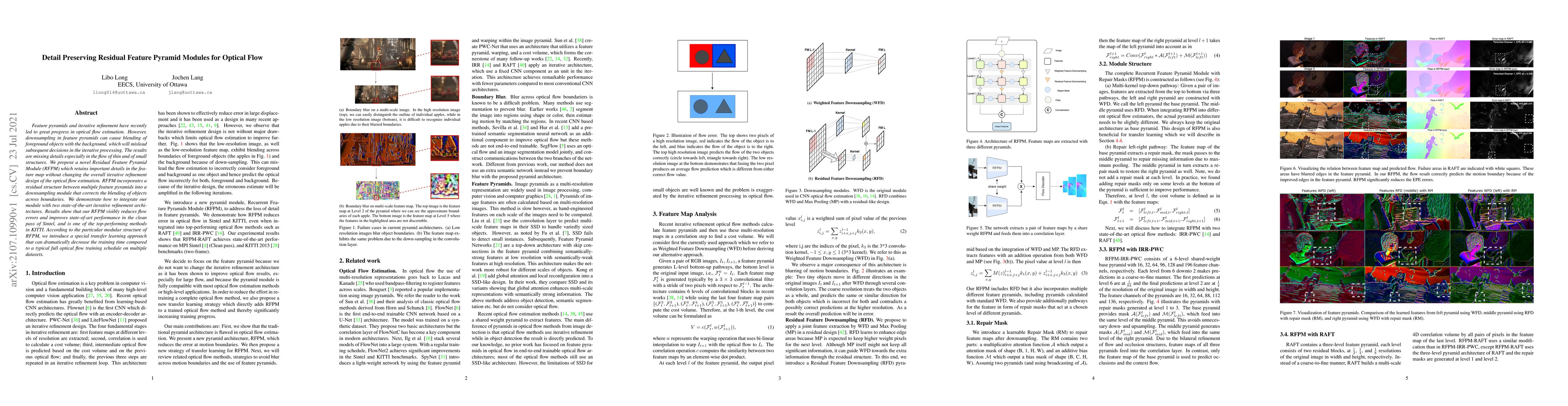 This paper proposes a Residual Feature Pyramid Module (RFPM) to enhance optical flow estimation by preserving details in feature maps, reducing blending of foreground and background, and improving iterative refinement. The RFPM integrates with existing architectures to achieve state-of-the-art performance on Sintel and KITTI datasets, while also significantly reducing training time through a specialized transfer learning approach.