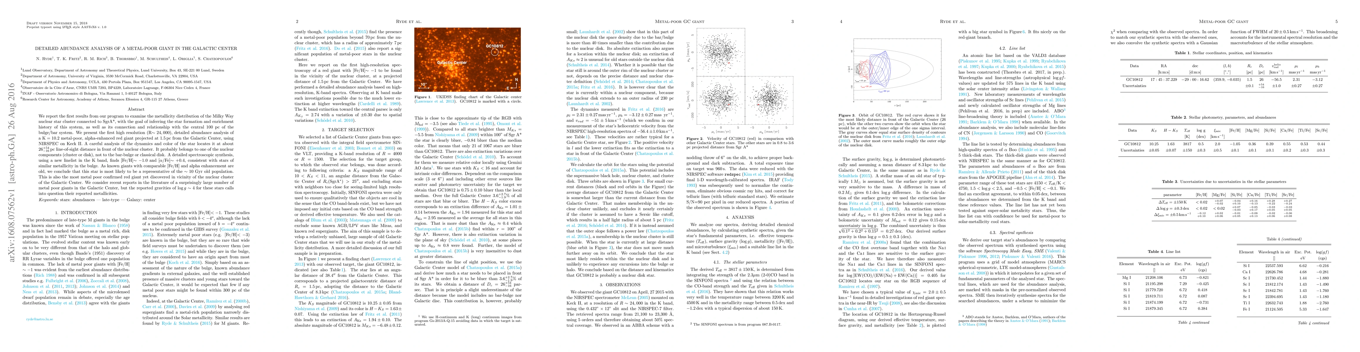 This paper presents a detailed abundance analysis of a metal-poor red giant near the Galactic Center, revealing [Fe/H]~-1.0 and [alpha/Fe]~+0.4, indicating it likely belongs to the ~10 Gyr old population of the nuclear cluster. The study highlights the star's significance as the most metal-poor confirmed red giant in the vicinity, questioning the metallicities of similarly reported but gravity-challenged stars.