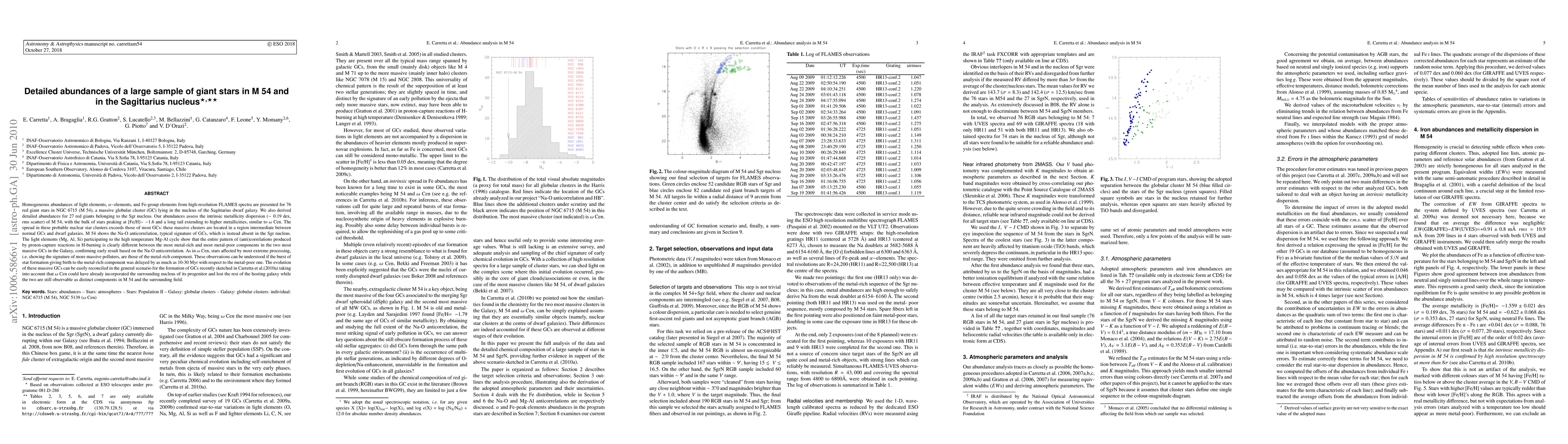 Homogeneous abundances of light elements, alpha and Fe-group elements from high-resolution FLAMES spectra are presented for 76 red giant stars in M54, a massive globular cluster (GC) lying in the nucleus of the Sagittarius dwarf galaxy. We also derived detailed abundances for 27 red giants belonging to the Sgr nucleus. Our abundances assess the intrinsic metallicity dispersion (~0.19 dex, rms scatter) of M54, with the bulk of stars peaking at [Fe/H]~-1.6 and a long tail extending to higher metallicities, similar to omega Cen. The spread in these probable nuclear star clusters exceeds those of most GCs: these massive clusters are located in a region intermediate between normal GCs and dwarf galaxies. M54 shows the Na-O anticorrelation, typical signature of GCs, which is instead absent in the Sgr nucleus. The light elements (Mg, Al, Si) participating to the high temperature Mg-Al cycle show that the pattern of (anti)correlations produced by proton-capture reactions in H-burning is clearly different between the most metal-rich and most metal-poor components in the two most massive GCs in the Galaxy, confirming early result based on the Na-O anticorrelation. As in omega Cen, stars affected by most extreme processing, i.e. showing the signature of more massive polluters, are those of the metal-rich component. This can be understood if the burst of star formation giving birth to the metal-rich component was delayed by as much as 10-30 Myr with respect to the metal-poor one. The evolution of these massive GCs can be reconciled in the general scenario for the formation of GCs sketched in Carretta et al.(2010a) taking into account that omega Cen could have already incorporated the surrounding nucleus of its progenitor and lost the rest of the hosting galaxy while the two are still observable as distinct components in M54 and the surrounding field.