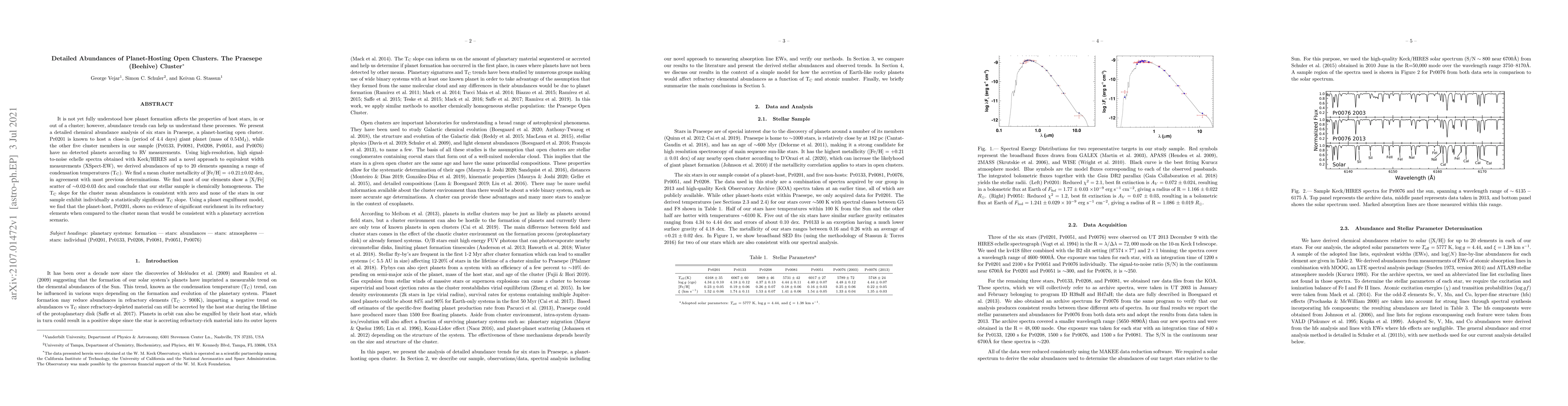 This study provides detailed chemical abundance analysis of six stars in the Praesepe cluster, including one known to host a giant planet. The analysis reveals a mean cluster metallicity of [Fe/H] = +0.21±0.02 dex and shows no significant chemical enrichment in the planet-hosting star compared to the cluster mean, suggesting no substantial impact from planet formation on the star's composition.