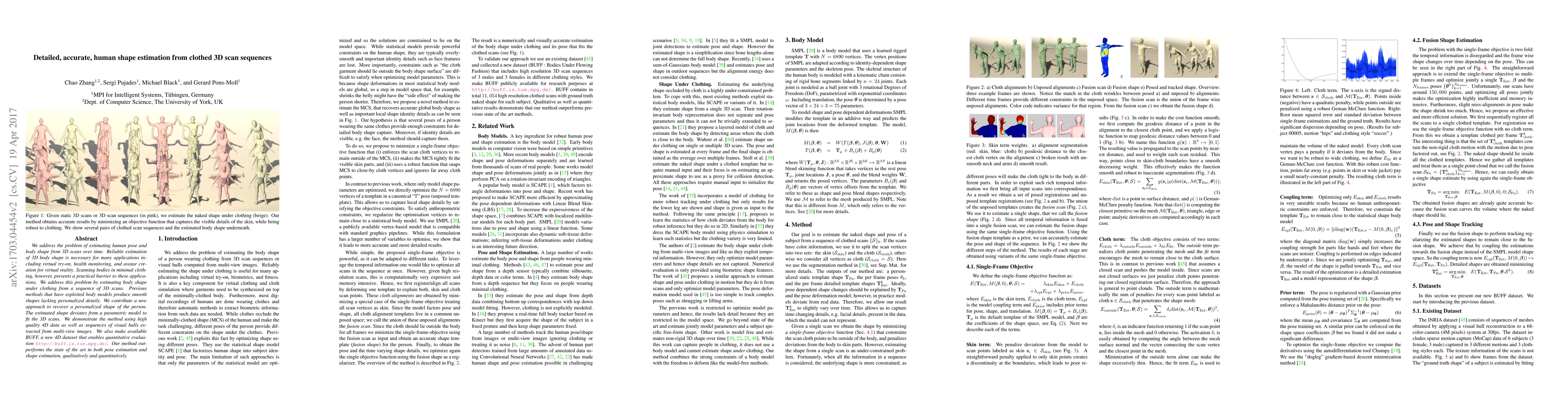 We address the problem of estimating human pose and body shape from 3D scans over time. Reliable estimation of 3D body shape is necessary for many applications including virtual try-on, health monitoring, and avatar creation for virtual reality. Scanning bodies in minimal clothing, however, presents a practical barrier to these applications. We address this problem by estimating body shape under clothing from a sequence of 3D scans. Previous methods that have exploited body models produce smooth shapes lacking personalized details. We contribute a new approach to recover a personalized shape of the person. The estimated shape deviates from a parametric model to fit the 3D scans. We demonstrate the method using high quality 4D data as well as sequences of visual hulls extracted from multi-view images. We also make available BUFF, a new 4D dataset that enables quantitative evaluation (http://buff.is.tue.mpg.de). Our method outperforms the state of the art in both pose estimation and shape estimation, qualitatively and quantitatively.