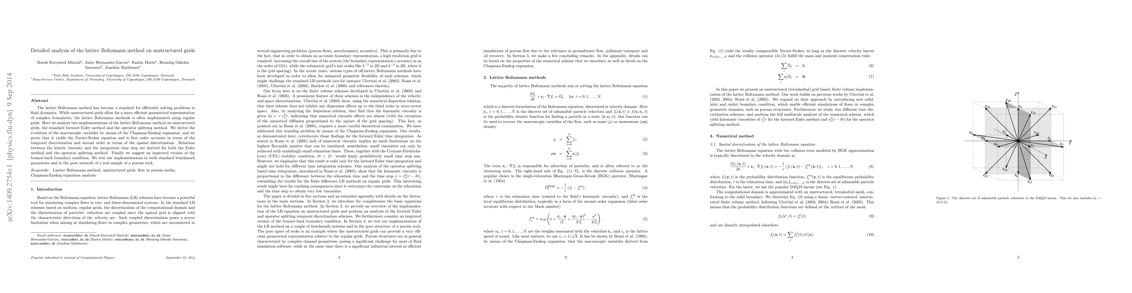 This paper analyzes two implementations of the lattice Boltzmann method on unstructured grids, demonstrating first-order temporal and second-order spatial accuracy. It proposes an improved bounce-back boundary condition and tests the methods in benchmark geometries and real porous rock samples.