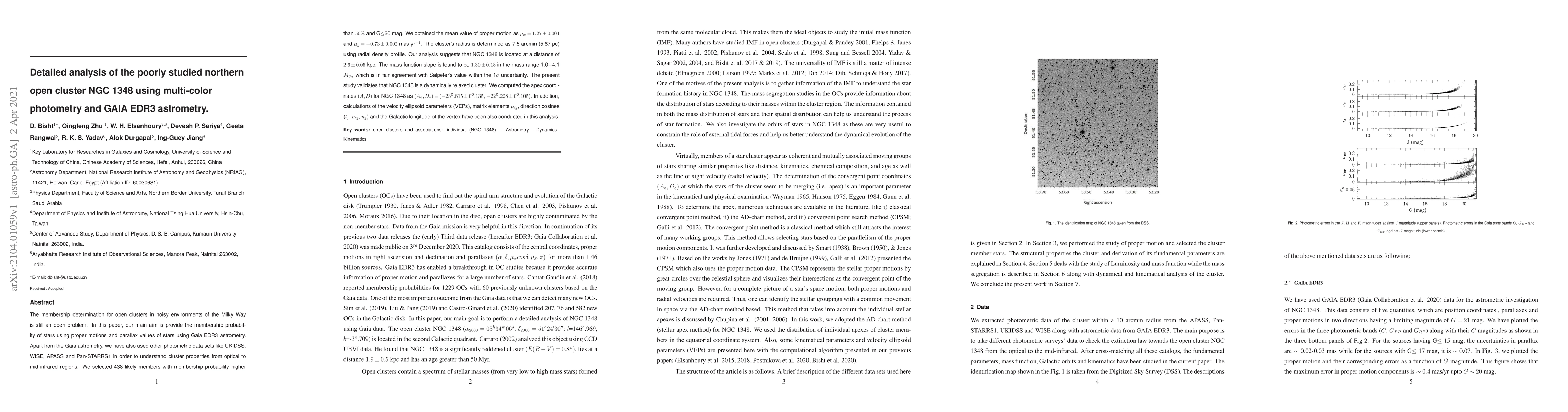 This paper analyzes the northern open cluster NGC 1348 using Gaia EDR3 astrometry and multi-color photometry, identifying 438 likely members. The study determines the cluster's radius, distance, and mass function slope, concluding that NGC 1348 is a dynamically relaxed cluster located at 2.6±0.05 kpc.