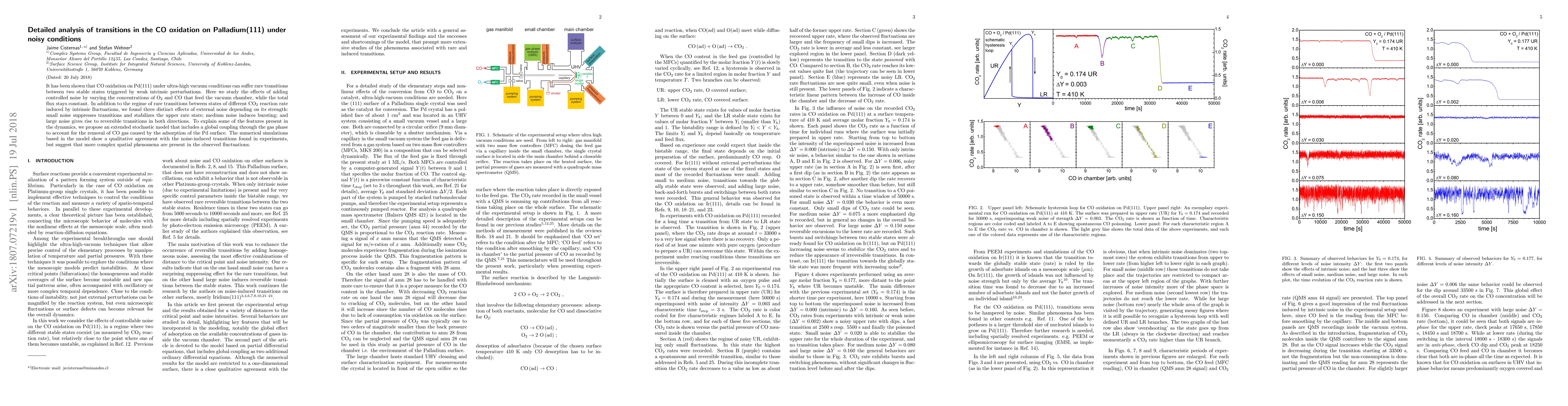 It has been shown that CO oxidation on Pd(111) under ultra-high vacuum conditions can suffer rare transitions between two stable states triggered by weak intrinsic perturbations. Here we study the effects of adding controlled noise by varying the concentrations of O2 and CO that feed the vacuum chamber, while the total flux stays constant. In addition to the regime of rare transitions between states of different CO2 reaction rate induced by intrinsic fluctuations, we found three distinct effects of external noise depending on its strength: small noise suppresses transitions and stabilizes the upper rate state; medium noise induces bursting; and large noise gives rise to reversible transitions in both directions. To explain some of the features present in the dynamics, we propose an extended stochastic model that includes a global coupling through the gas phase to account for the removal of CO gas caused by the adsorption of the Pd surface. The numerical simulations based in the model show a qualitative agreement with the noise-induced transitions found in experiments, but suggest that more complex spatial phenomena are present in the observed fluctuations.