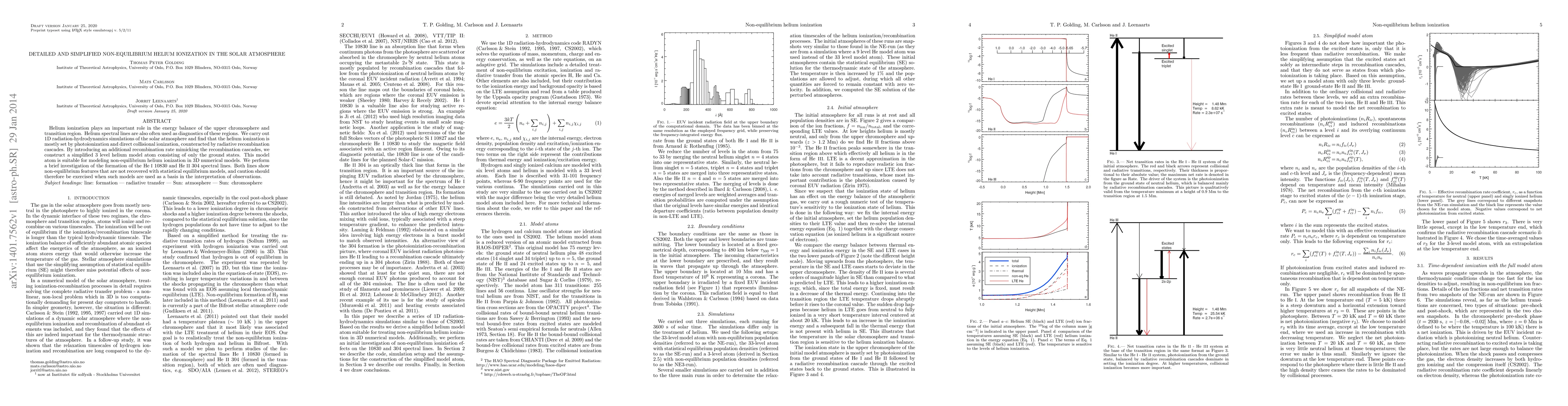 Helium ionization plays an important role in the energy balance of the upper chromosphere and transition region. Helium spectral lines are also often used as diagnostics of these regions. We carry out 1D radiation-hydrodynamics simulations of the solar atmosphere and find that the helium ionization is mostly set by photoionization and direct collisional ionization, counteracted by radiative recombination cascades. By introducing an additional recombination rate mimicking the recombination cascades, we construct a simplified 3 level helium model atom consisting of only the ground states. This model atom is suitable for modeling non-equilibrium helium ionization in 3D numerical models. We perform a brief investigation of the formation of the He I 10830 and He II 304 spectral lines. Both lines show non-equilibrium features that are not recovered with statistical equilibrium models, and caution should therefore be exercised when such models are used as a basis in the interpretation of observations.