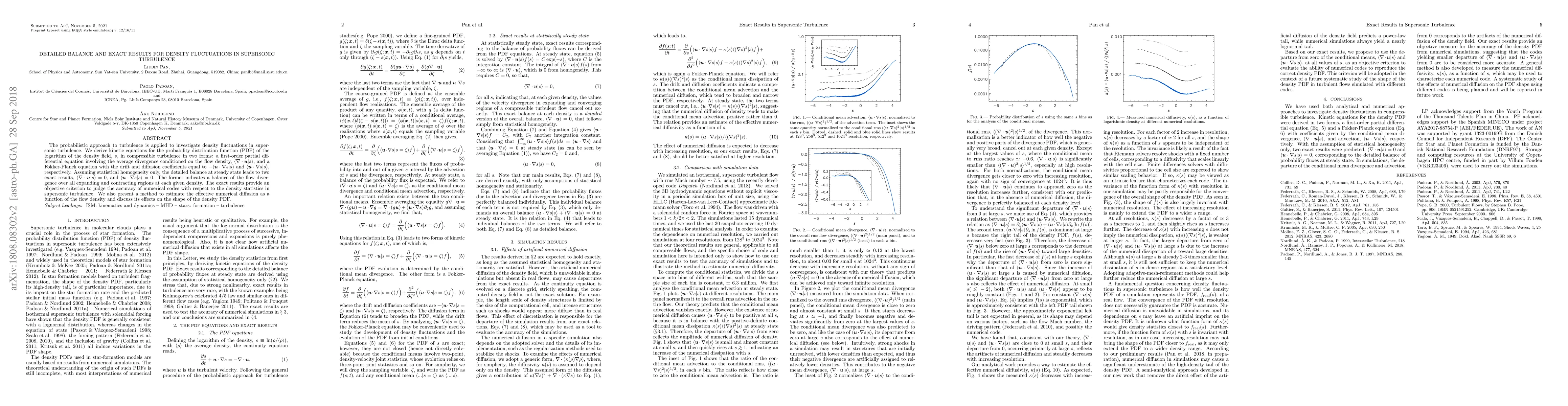 The probabilistic approach to turbulence is applied to investigate density fluctuations in supersonic turbulence. We derive kinetic equations for the probability distribution function (PDF) of the logarithm of the density field, $s$, in compressible turbulence in two forms: a first-order partial differential equation involving the average divergence conditioned on the flow density, $\langle \nabla \cdot {\bs u} | s\rangle$, and a Fokker-Planck equation with the drift and diffusion coefficients equal to $-\langle {\bs u} \cdot \nabla s | s\rangle$ and $\langle {\bs u} \cdot \nabla s | s\rangle$, respectively. Assuming statistical homogeneity only, the detailed balance at steady state leads to two exact results, $\langle \nabla \cdot {\bs u} | s \rangle =0$, and $\langle {\bs u} \cdot \nabla s | s\rangle=0$. The former indicates a balance of the flow divergence over all expanding and contracting regions at each given density. The exact results provide an objective criterion to judge the accuracy of numerical codes with respect to the density statistics in supersonic turbulence. We also present a method to estimate the effective numerical diffusion as a function of the flow density and discuss its effects on the shape of the density PDF.