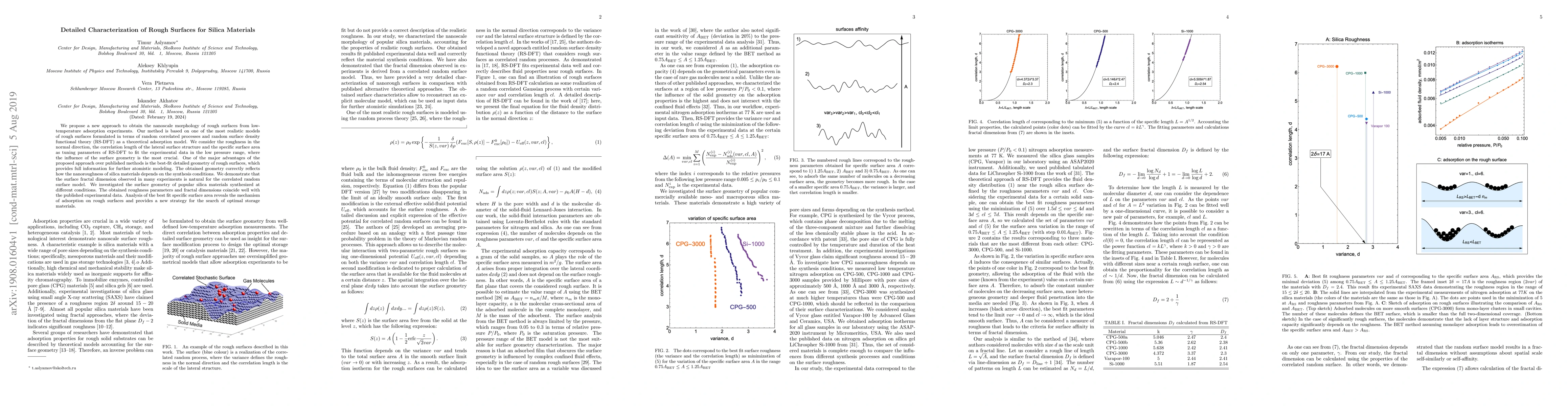 We propose a new approach to obtain the nanoscale morphology of rough surfaces from low-temperature adsorption experiments. Our method is based on one of the most realistic models of rough surfaces formulated in terms of random correlated processes and random surface density functional theory (RS-DFT) as a theoretical adsorption model. We consider the roughness in the normal direction, the correlation length of the lateral surface structure and the specific surface area as tuning parameters of RS-DFT to fit the experimental data in the low pressure range, where the influence of the surface geometry is the most crucial. One of the major advantages of the proposed approach over published methods is the best-fit detailed geometry of rough surfaces, which provides full information for further atomistic modeling. The obtained geometry correctly reflects how the nanoroughness of silica materials depends on the synthesis conditions. We demonstrate that the surface fractal dimension observed in many experiments is natural for the correlated random surface model. We investigated the surface geometry of popular silica materials synthesized at different conditions. The obtained roughness parameters and fractal dimensions coincide well with the published experimental data. Analysis of the best fit specific surface area reveals the mechanism of adsorption on rough surfaces and provides a new strategy for the search of optimal storage materials.