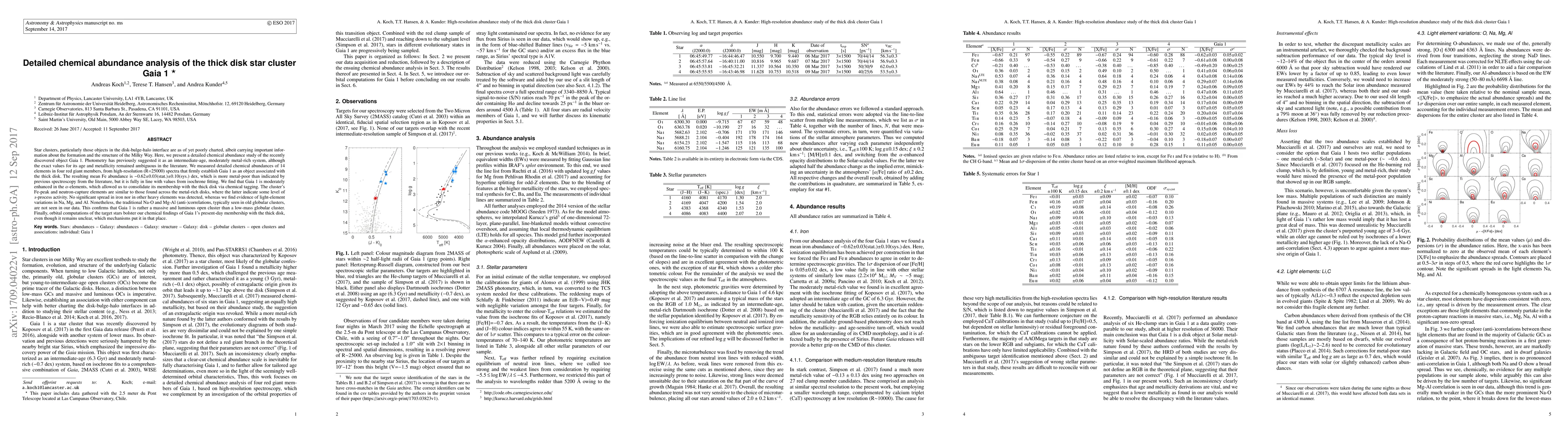 This research provides a detailed chemical abundance analysis of the star cluster Gaia 1, confirming its association with the Milky Way's thick disk. The study reveals a mean Fe abundance of $-0.62\pm$0.03 dex, indicating it is more metal-poor than previously thought, and shows no significant spread in heavy elements, suggesting it is a massive and luminous open cluster rather than a low-mass globular cluster.