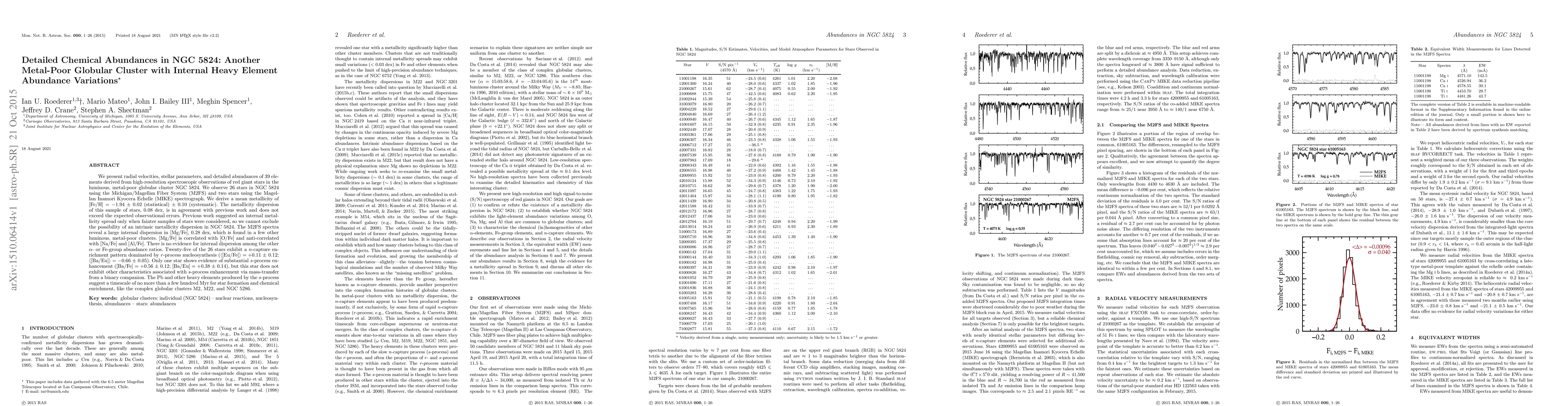 We present radial velocities, stellar parameters, and detailed abundances of 39 elements derived from high-resolution spectroscopic observations of red giant stars in the luminous, metal-poor globular cluster NGC 5824. We observe 26 stars in NGC 5824 using the Michigan/Magellan Fiber System (M2FS) and two stars using the Magellan Inamori Kyocera Echelle (MIKE) spectrograph. We derive a mean metallicity of [Fe/H]=-1.94+/-0.02 (statistical) +/-0.10 (systematic). The metallicity dispersion of this sample of stars, 0.08 dex, is in agreement with previous work and does not exceed the expected observational errors. Previous work suggested an internal metallicity spread only when fainter samples of stars were considered, so we cannot exclude the possibility of an intrinsic metallicity dispersion in NGC 5824. The M2FS spectra reveal a large internal dispersion in [Mg/Fe], 0.28 dex, which is found in a few other luminous, metal-poor clusters. [Mg/Fe] is correlated with [O/Fe] and anti-correlated with [Na/Fe] and [Al/Fe]. There is no evidence for internal dispersion among the other alpha- or Fe-group abundance ratios. Twenty-five of the 26 stars exhibit a n-capture enrichment pattern dominated by r-process nucleosynthesis ([Eu/Fe]=+0.11+/-0.12; [Ba/Eu]=-0.66+/-0.05). Only one star shows evidence of substantial s-process enhancement ([Ba/Fe]=+0.56+/-0.12; [Ba/Eu]=+0.38+/-0.14), but this star does not exhibit other characteristics associated with s-process enhancement via mass-transfer from a binary companion. The Pb and other heavy elements produced by the s-process suggest a timescale of no more than a few hundred Myr for star formation and chemical enrichment, like the complex globular clusters M2, M22, and NGC 5286.