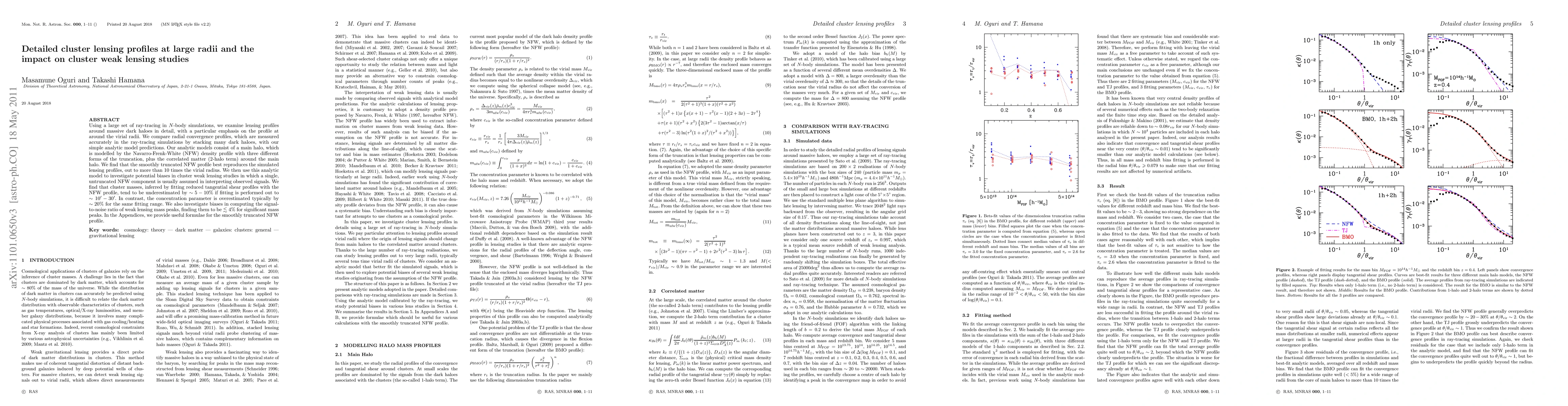 Using a large set of ray-tracing in N-body simulations, we examine lensing profiles around massive dark haloes in detail, with a particular emphasis on the profile at around the virial radii. We compare radial convergence profiles, which are measured accurately in the ray-tracing simulations by stacking many dark haloes, with our simple analytic model predictions. Our analytic models consist of a main halo, which is modelled by the Navarro-Frenk-White (NFW) density profile with three different forms of the truncation, plus the correlated matter (2-halo term) around the main halo. We find that the smoothly truncated NFW profile best reproduces the simulated lensing profiles, out to more than 10 times the virial radius. We then use this analytic model to investigate potential biases in cluster weak lensing studies in which a single, untruncated NFW component is usually assumed in interpreting observed signals. We find that cluster masses, inferred by fitting reduced tangential shear profiles with the NFW profile, tend to be underestimated by ~5-10% if fitting is performed out to ~10'-30'. In contrast, the concentration parameter is overestimated typically by ~20% for the same fitting range. We also investigate biases in computing the signal-to-noise ratio of weak lensing mass peaks, finding them to be <4% for significant mass peaks. In the Appendices, we provide useful formulae for the smoothly truncated NFW profile.