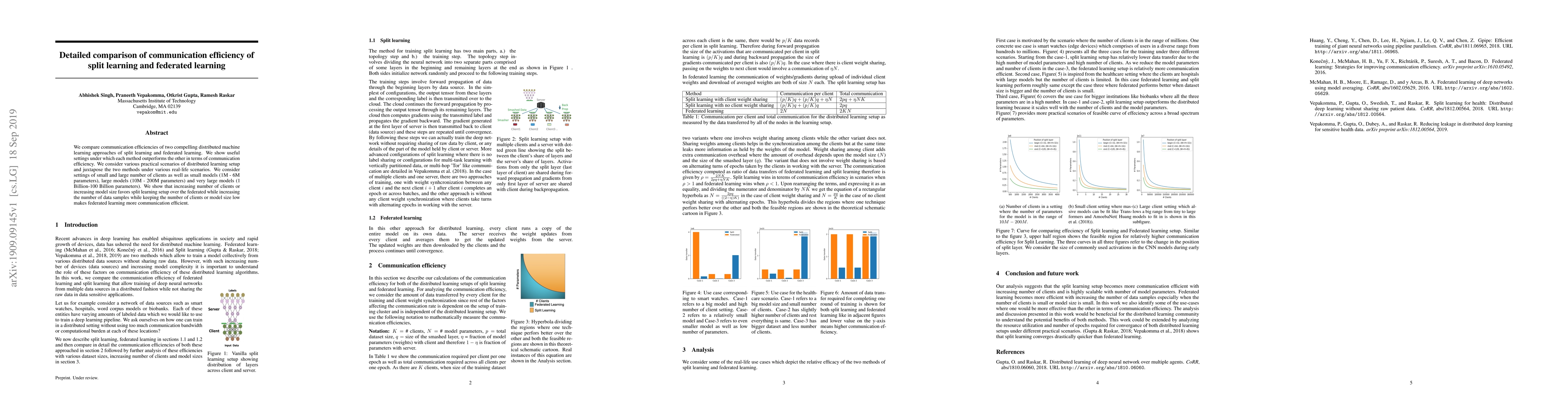 We compare communication efficiencies of two compelling distributed machine learning approaches of split learning and federated learning. We show useful settings under which each method outperforms the other in terms of communication efficiency. We consider various practical scenarios of distributed learning setup and juxtapose the two methods under various real-life scenarios. We consider settings of small and large number of clients as well as small models (1M - 6M parameters), large models (10M - 200M parameters) and very large models (1 Billion-100 Billion parameters). We show that increasing number of clients or increasing model size favors split learning setup over the federated while increasing the number of data samples while keeping the number of clients or model size low makes federated learning more communication efficient.