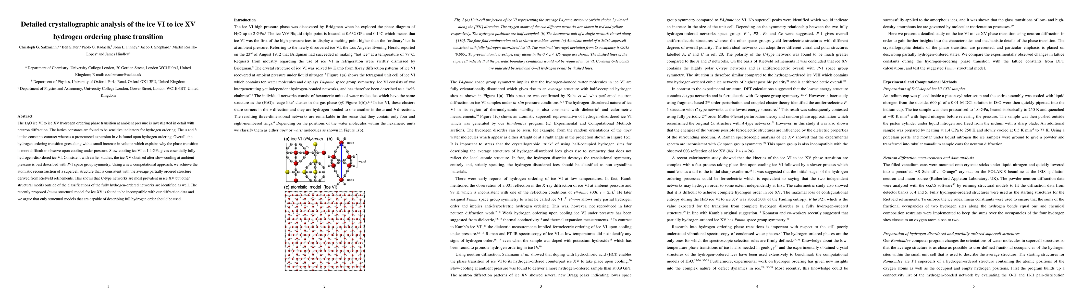 The D2O ice VI to ice XV hydrogen ordering phase transition at ambient pressure is investigated in detail with neutron diffraction. The lattice constants are found to be sensitive indicators for hydrogen ordering. The a and b lattice constants contract whereas a pronounced expansion in c is found upon hydrogen ordering. Overall, the hydrogen ordering transition goes along with a small increase in volume which explains why the phase transition is more difficult to observe upon cooling under pressure. Slow-cooling ice VI at 1.4 GPa gives essentially fully hydrogen-disordered ice VI. Consistent with earlier studies, the ice XV obtained after slow-cooling at ambient pressure is best described with P-1 space group symmetry. Using a new computational approach, we achieve the atomistic reconstruction of a supercell structure that is consistent with the average partially ordered structure derived from Rietveld refinements. This shows that C-type networks are most prevalent in ice XV but other structural motifs outside of the classifications of the fully hydrogen-ordered networks are identified as well. The recently proposed Pmmn structural model for ice XV is found to be incompatible with our diffraction data and we argue that only structural models that are capable of describing full hydrogen order should be used.