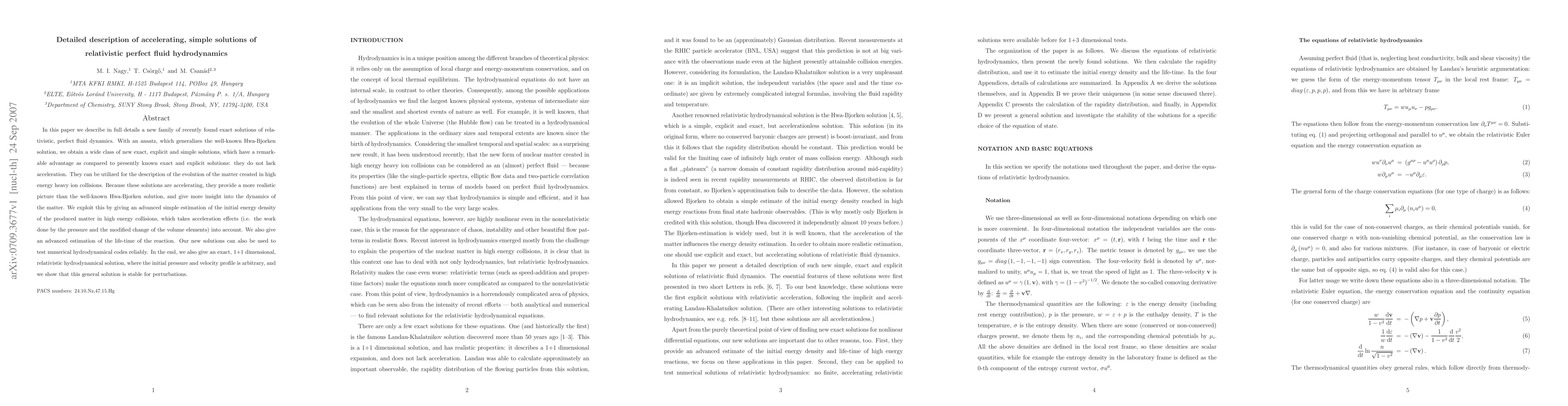 In this paper we describe in full details a new family of recently found exact solutions of relativistic, perfect fluid dynamics. With an ansatz, which generalizes the well-known Hwa-Bjorken solution, we obtain a wide class of new exact, explicit and simple solutions, which have a remarkable advantage as compared to presently known exact and explicit solutions: they do not lack acceleration. They can be utilized for the description of the evolution of the matter created in high energy heavy ion collisions. Because these solutions are accelerating, they provide a more realistic picture than the well-known Hwa-Bjorken solution, and give more insight into the dynamics of the matter. We exploit this by giving an advanced simple estimation of the initial energy density of the produced matter in high energy collisions, which takes acceleration effects (i.e. the work done by the pressure and the modified change of the volume elements) into account. We also give an advanced estimation of the life-time of the reaction. Our new solutions can also be used to test numerical hydrodynamical codes reliably. In the end, we also give an exact, 1+1 dimensional, relativistic hydrodynamical solution, where the initial pressure and velocity profile is arbitrary, and we show that this general solution is stable for perturbations.
